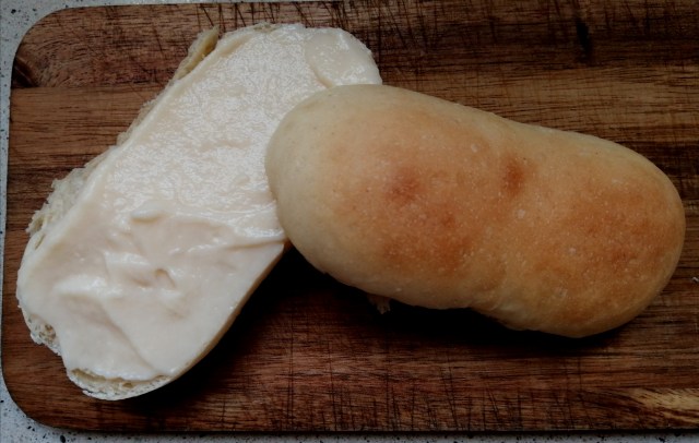 En primer lugar haremos los bollitos. Disolvemos la levadura en la leche y reservamos. Mezclamos la harina, el azúcar y la sal y le añadimos la levadura disuelta en leche. Añadimos el huevo batido y la mantequilla y amasamos todo hasta obtener un bollo.