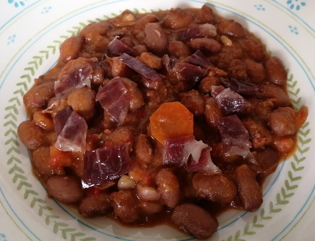 • En una olla rápida ponemos las judías con el laurel, comino y zanahorias peladas y cortadas en rodajas. Añadimos lo que hemos batido y probamos de sal. Cubrimos bien de agua y lo ponemos al fuego.