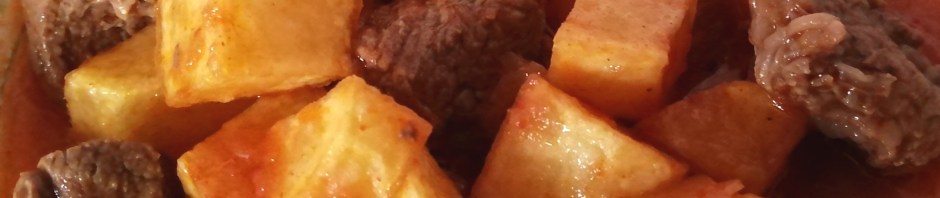 Freímos patatas en forma de dados y las añadimos a la olla, para que se mezclen con la salsa y la carne. Muy muy rica esta carne «al toro», probadla.