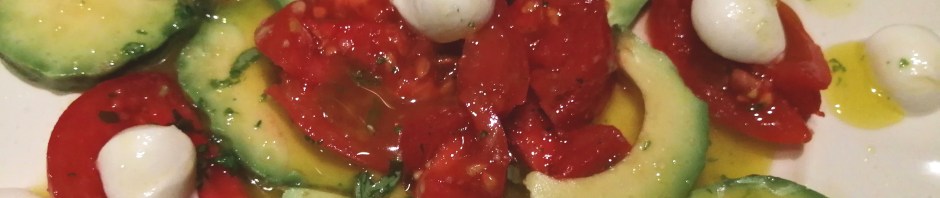 La original lleva albahaca fresca, queso mozzarella, tomate y el aliño con aceite e oliva, en esta ocasión yo he puesto aguacate y la albahaca va infusionada en el aceite. Además he añadido pimientos asados.