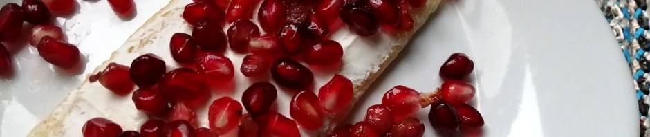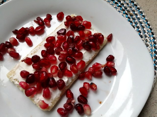 Untamos las tostas con el queso y echamos por encima los granos de la fruta, y listo, así de sencillo. Cada bocado, mezclando el sabor del queso y el de la granada, es exquisito.