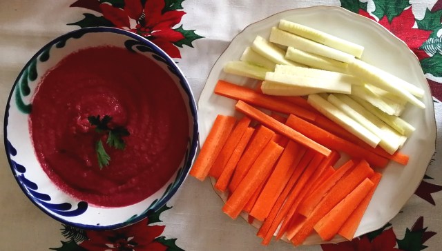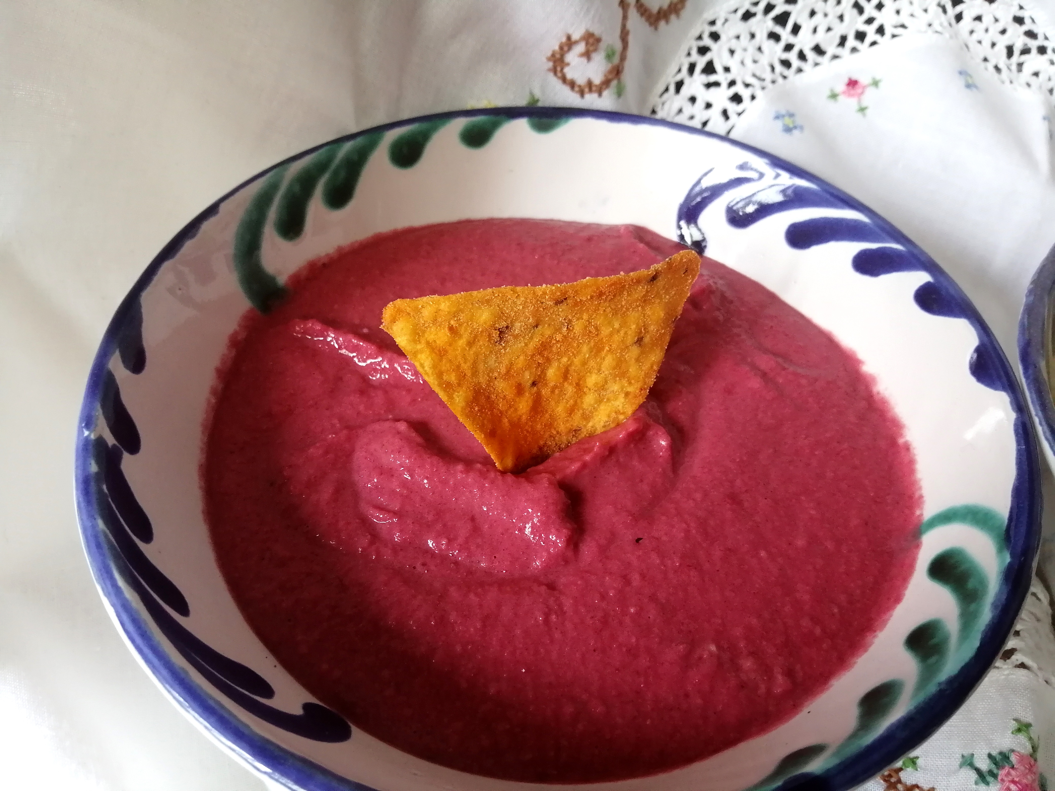 Con motivo de la Navidad he hecho hummus de remolacha, para tomar con crudités y doritos. Esta receta se diferencia de la ya publicada porque lleva aceite de oliva virgen extra, lo que le da una untuosidad muy agradable.