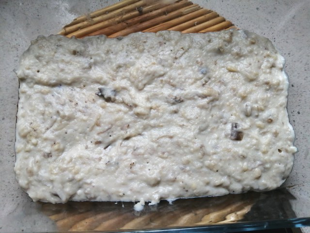 Pelamos la berenjena y la cortamos en cuadraditos. En una sartén u olla echamos un poco de aceite y freímos el ajo picadito. Echamos la berenjena y la pasamos por el aceite, añadimos un poco de agua y sal y dejamos que se ponga tierna. Salamos a gusto. La aplastamos con un tenedor o «aplastapatatas». Añadimos tres cucharadas soperas bien llenas de harina y mezclamos, hasta que se una bien, echamos dos vasos de leche y sal y movemos con cuchara o pala de madera sin dejar de mover hasta que se forme la masa de las croquetas. La pasamos a una bandeja y la dejamos enfriar.