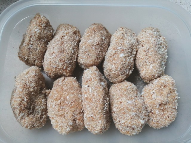 Cuando esté fría hacemos las croquetas y las pasamos por pan rallado, huevo batido y, de nuevo, pan rallado.