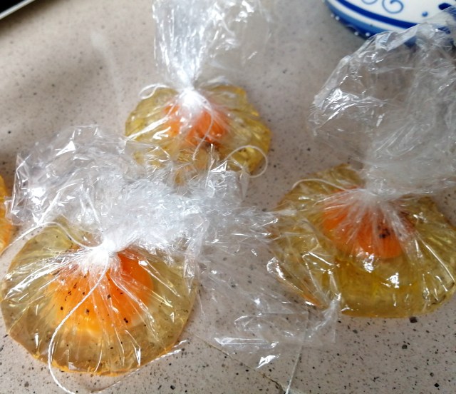Ya tenemos hechas las verduras y ahora hacemos los huevos. Cogemos un vaso chato, bajito, y le ponemos encima papel film, haciendo un hueco para meter el huevo dentro. Pintamos con aceite para que se despegue del film con facilidad. Lo echamos y espolvoreamos sal y pimienta molida, cerramos el paquetito con hilo de cocina y los ponemos a cocer en agua hirviendo. Si queremos la yema poco hecha solo los dejamos dos minutos, si la queremos más hecha esperamos tres minutos.