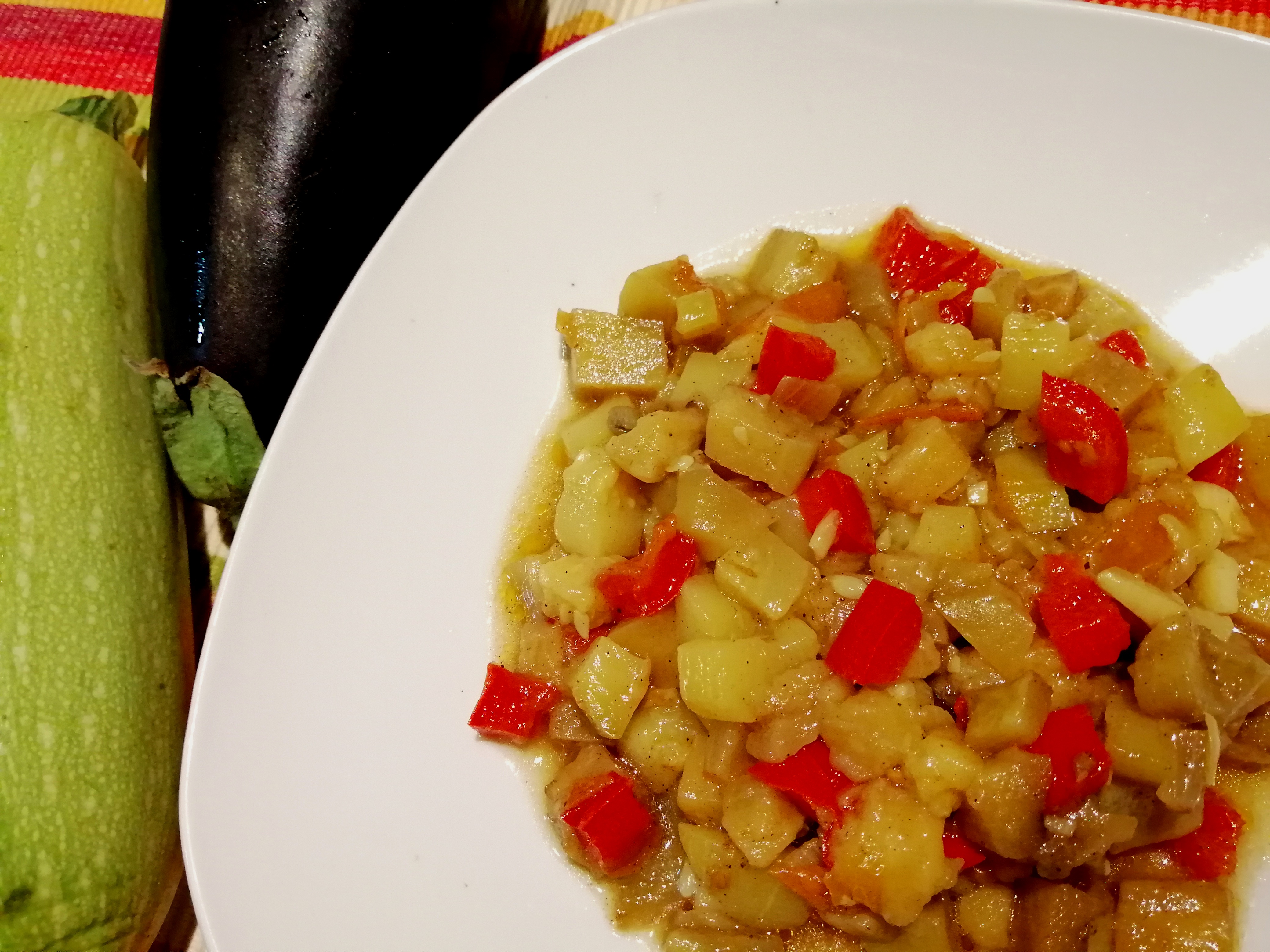 Sofreímos la cebolla y el ajo picados, añadimos la berenjena y el calabacín en dados, luego el tomate, pasamos todo. Añadimos la sal, la guindilla cortadita y sin semillas, la canela y la pimienta, removemos todo. La canela le da un sabor distinto y muy rico.