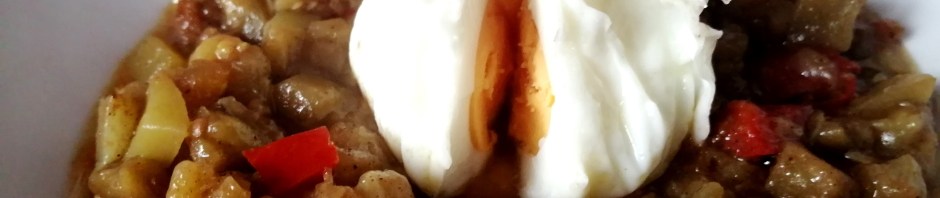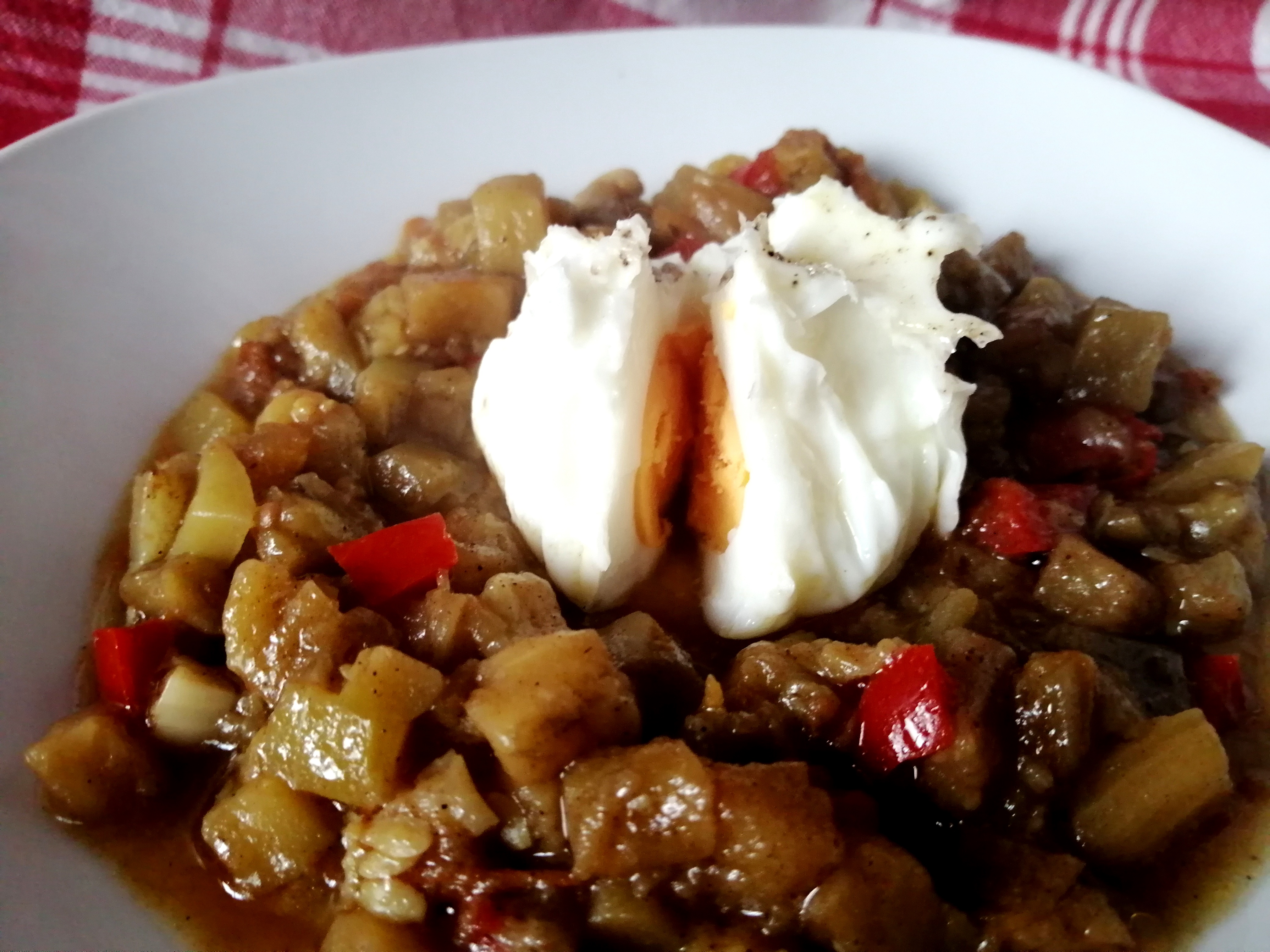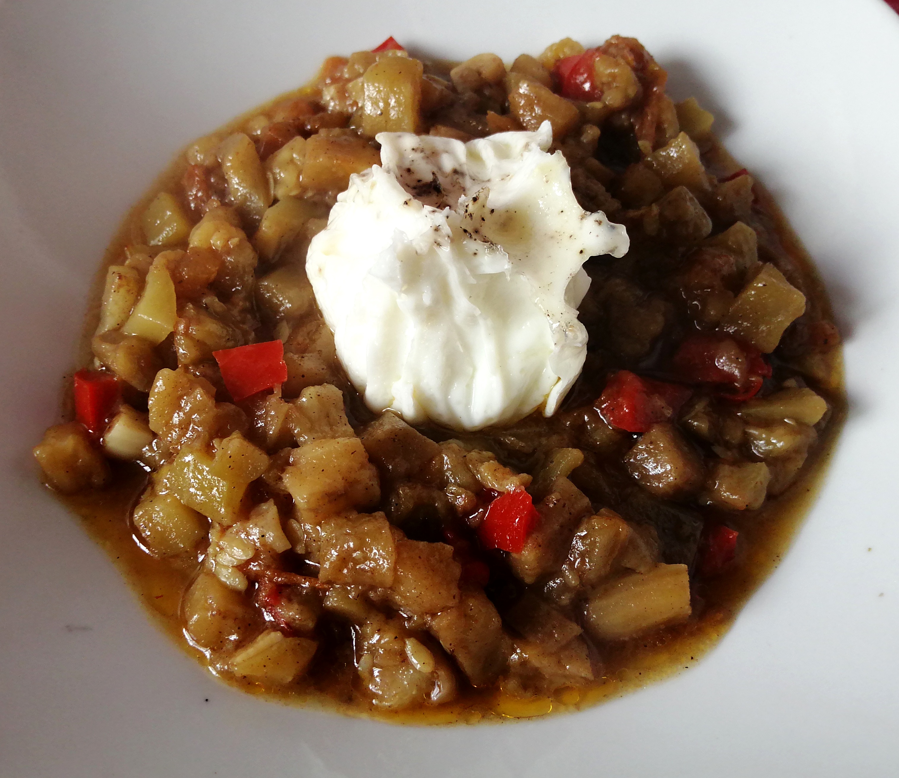 Esta receta se compone de dos, por una parte las verduras, que las cocinaremos como un pisto con berenjenas y un toque especial, canela en polvo. Y por otra parte los huevos escalfados que los haremos con papel film para que queden recogidos.