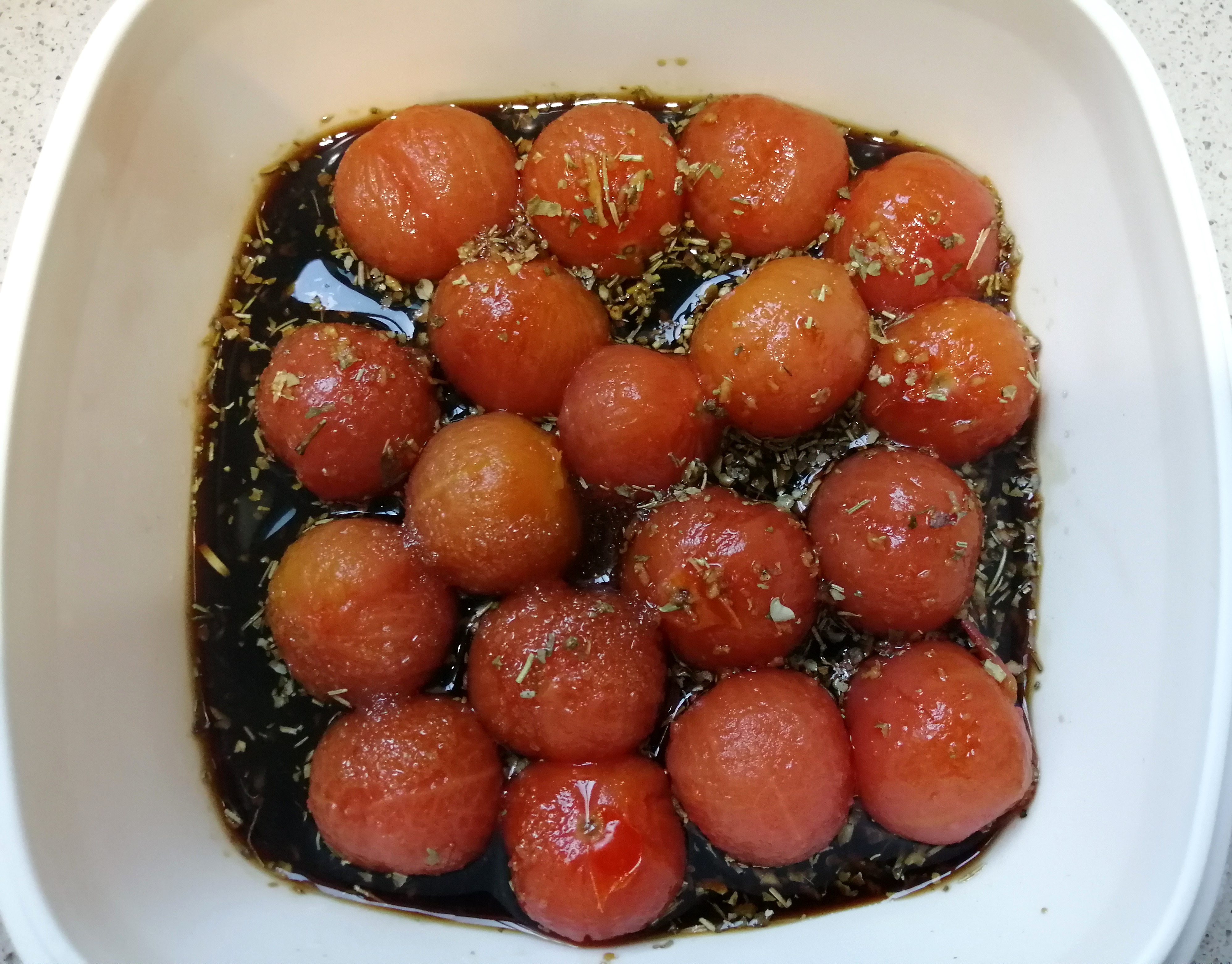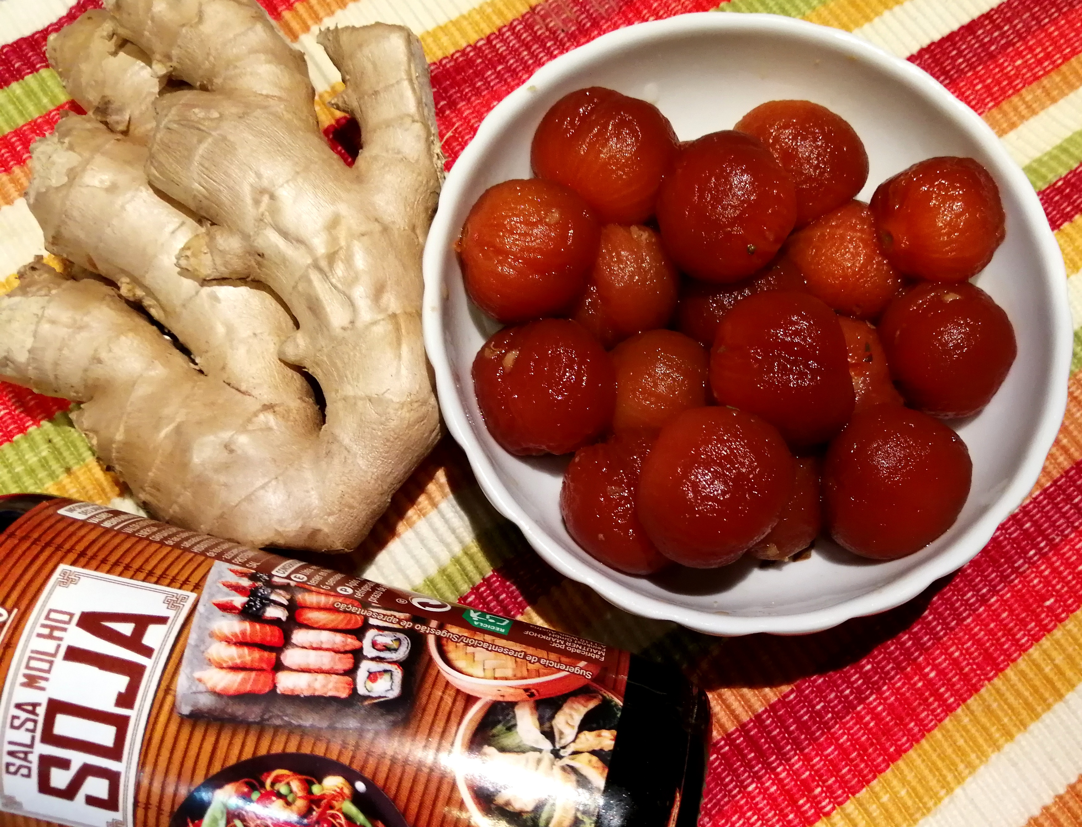 Se dejan maridando durante 24 horas en una mezcla de todos los ingredientes. Ya he comentado que las cantidades pueden variar, según el gusto. Yo usé la cantidad de soja necesaria para que todos los tomatitos quedaran medio cubiertos.