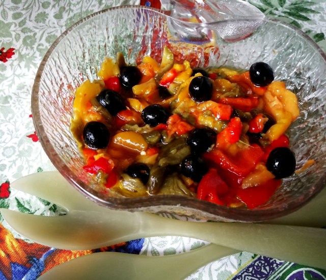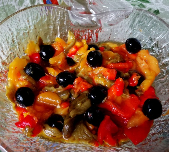 Los ponemos en un cuenco con aceitunas, echgamos sal, vinagre y aceite, por este orden, removemos bien para que se integre el aliño.