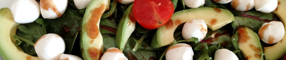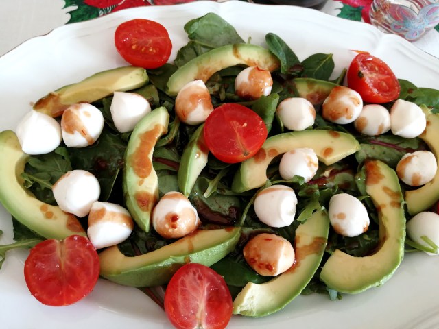 Ponemos en un cuenco el aguacate pelado y cortado, las hojas de espinacas, tomatitos cortados por la mitad y bolitas de mozarella.
