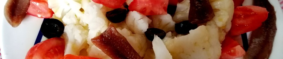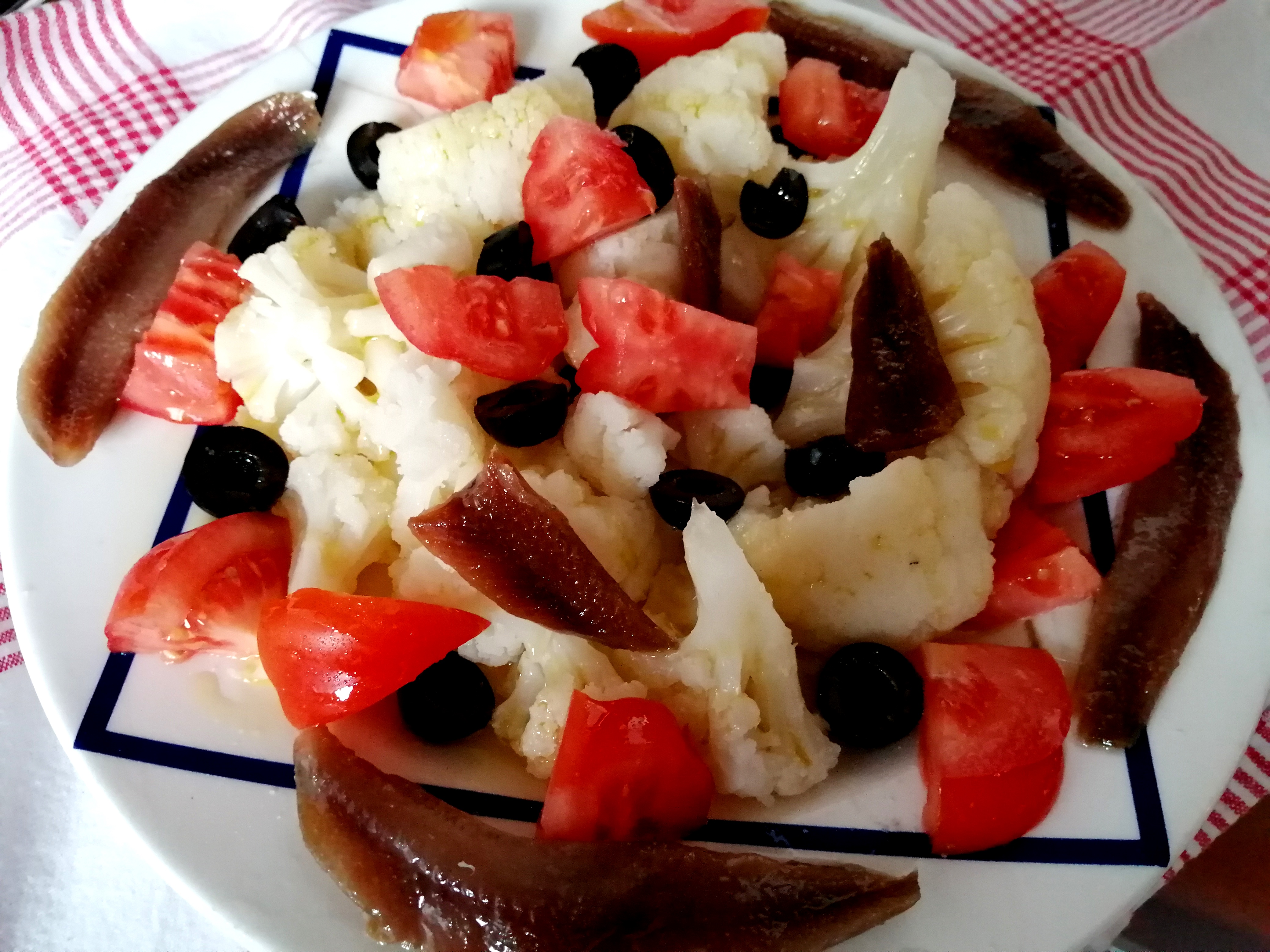 Cortamos la coliflor en ramitas y la cocemos en agua con sal hasta que esté tierna. Cortamos el tomate en trozos y las aceitunas en rodajitas, aunque podemos dejarlas enteras. Echamos estos los ingredientes en un cuenco o ensaladera y los aliñamos con sal, vinagre y aceite. Por último añadimos las anchoas.