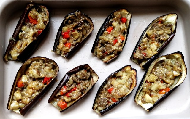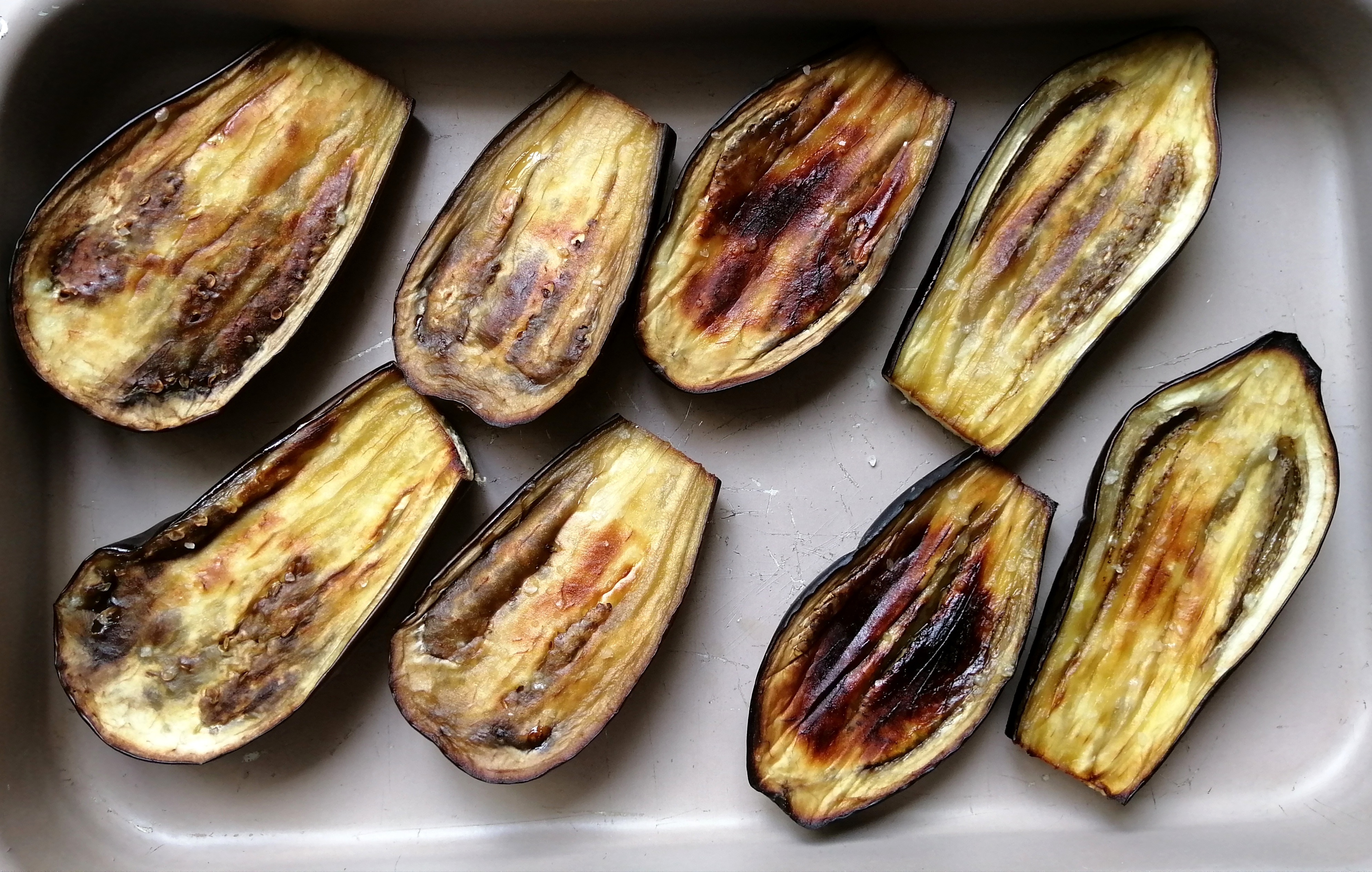 Cortamos las berenjenas por la mitad a lo largo y las ponemos al horno, calentado a 200º, con sal y aceite por encima. Cuando estén blandas se sacan y se dejan enfriar un poco.