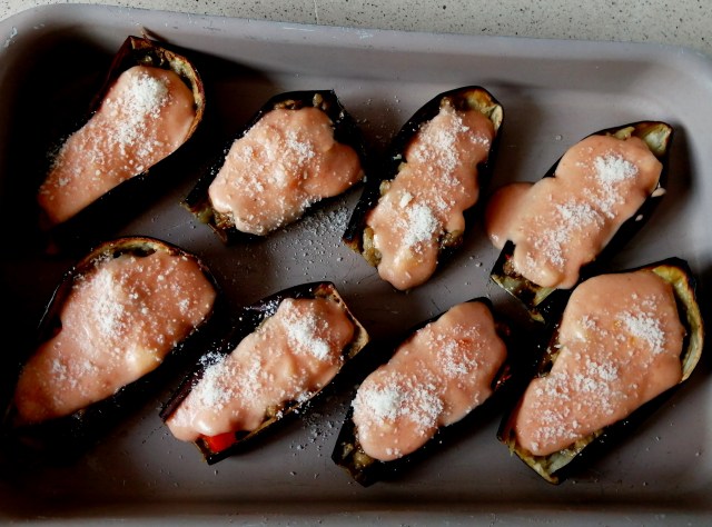 Hacemos la bechamel, pero cuando echemos la leche y la harina ya esté mezclada, añadimos los daditos de queso, removemos constantemente hasta que se derritan. Añadimos dos cucharadas de tomate frito y mezclamos bien. Con esta bechamel rosa cubrimos las berenjenas y echamos queso rallado por encima.