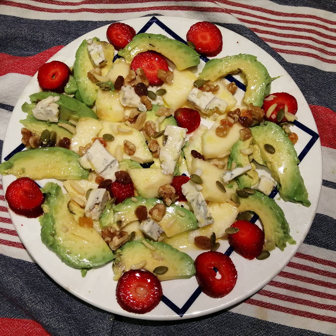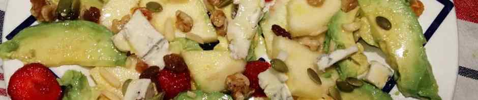 Aunque aún no ha llegado oficialmente la primavera estamos disfrutando de un tiempo primaveral. Hace calor. Y con este tiempo ya apetecen las ensaladas, aunque una buena ensalada viene bien siempre. Esta tiene fresas, y su inclusión como ingrediente ha sido de casualidad, pues compré fresas y, como duran tan poco tiempo porque se echan a perder muy pronto, algunas se pusieron algo pochas, así que las aproveché para incluirla las partes buenas en esta ensalada.