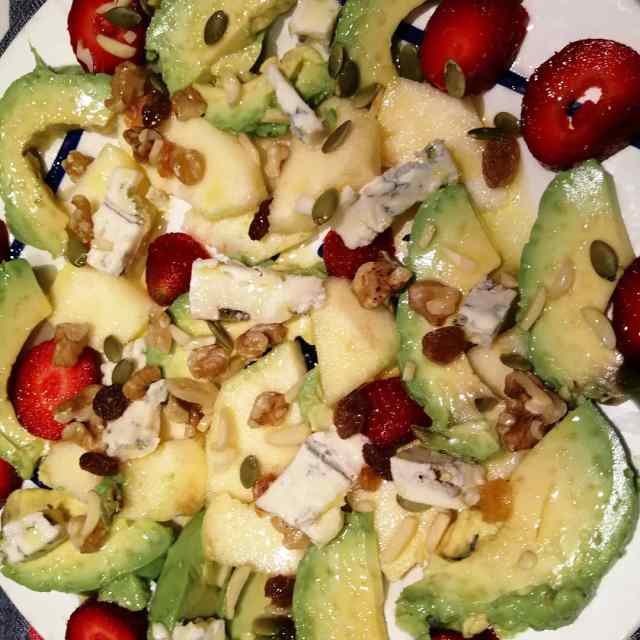 Pelamos y cortamos en trozos el aguacate y la manzana. Cortamos las fresas en trocitos o rodajas y partimos en queso también en trocitos.