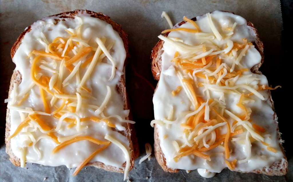Ponemos en una bandeja de horno tres rodajas de pan de molde y las untamos con bechamel, encima ponemos una loncha de queso y otra de jamón cocido.