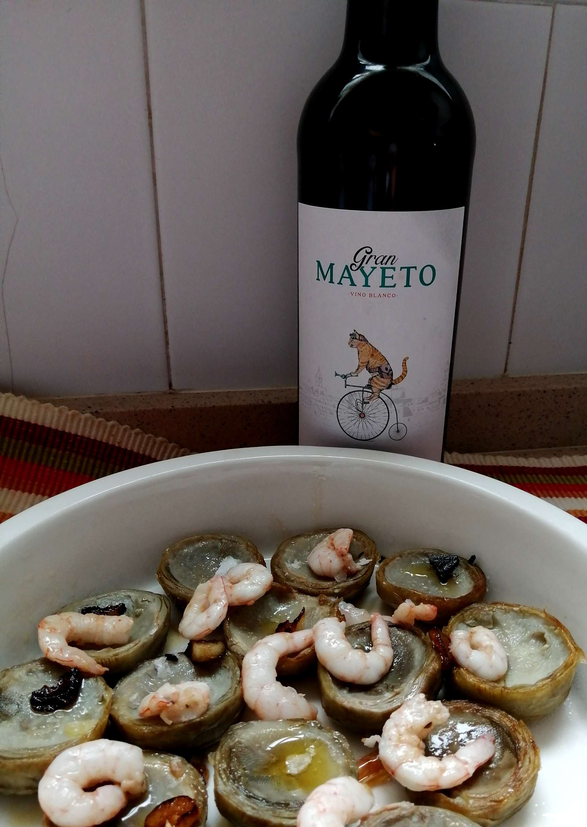 También podemos usar los corazones de alcachofa confitados para tomarlos con gambas. Solo tendremos que freír unos dientes de ajo, pasar las alcachofas y hervirlas con vino, hemos elegido Gran Mayeto de Bodegas El gato, que proporciona un sabor muy bueno a todos los platos a los que se añada.. Después añadimos las gambas y en cuanto estén hechas las apartamos. Huelen a gambas al ajillo…riquísimas.