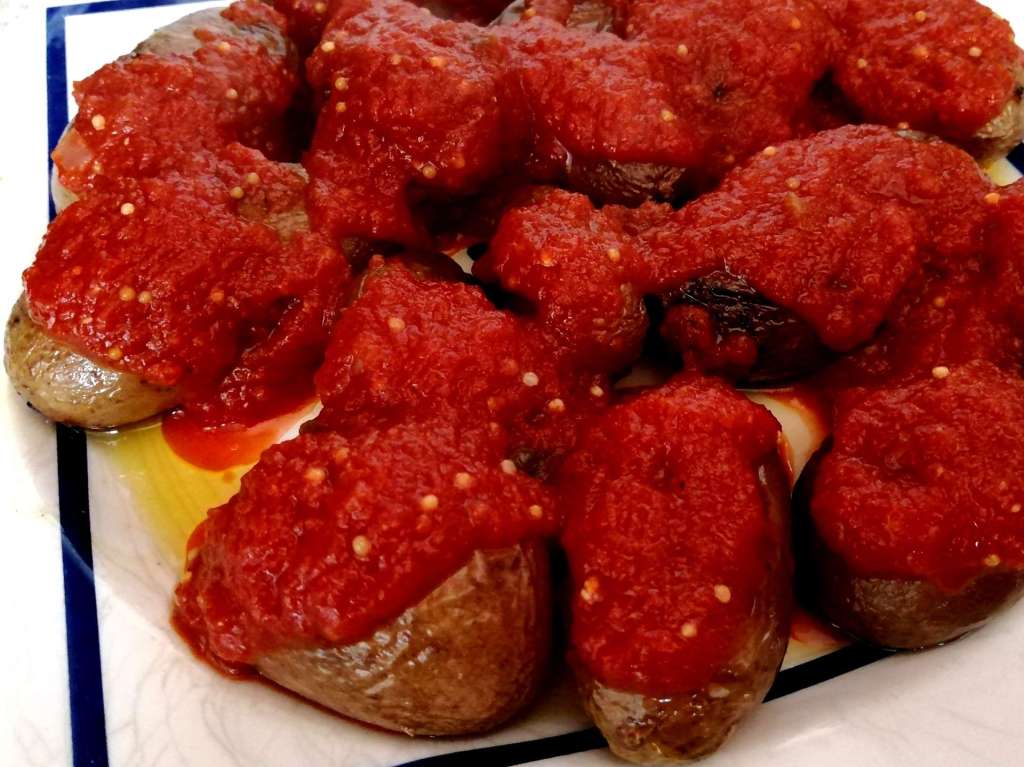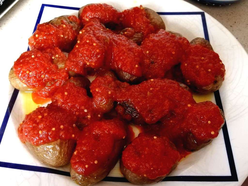 Ponemos las patatas en una bandeja de horno, les echamos aceite de oliva por encima y las metemos en el horno unos 10 minutos, para que la piel quede crujiente. Las sacamos y echamos por encima la salsa. Buenísimas.