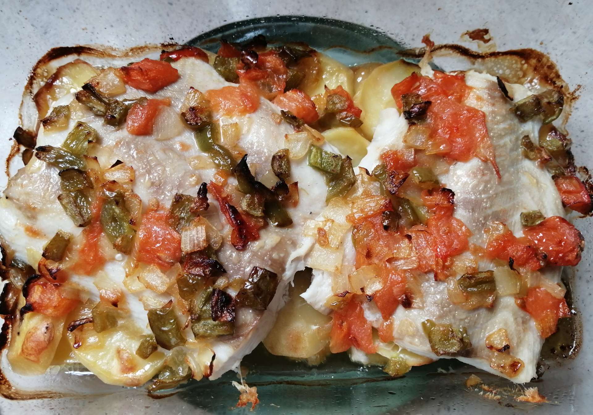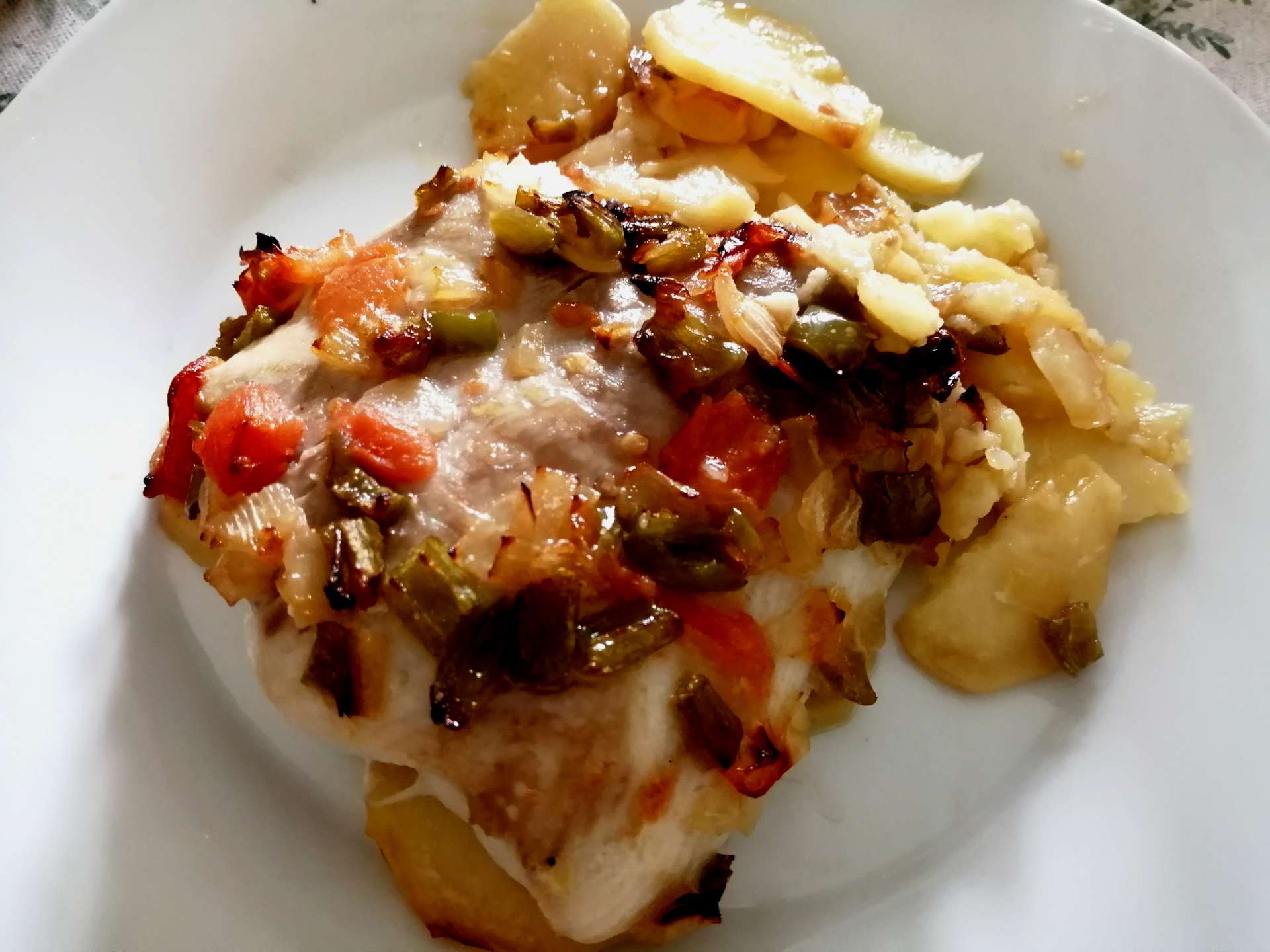 Calentamos el horno a 180º y metemos el pescado ya preparado. Lo dejamos hasta que el pescado esté hecho y las patatas tiernas. Si las hemos cortado finitas se harán en el mismo tiempo que el pescado. El pescado debe quedar jugoso, no seco, por lo que si cortamos las patatas en rodajas más gruesas debemos hacerlas solas unos minutos antes y, una vez estén a medio hacer, colocar el pescado y las verduras. Así las patatas quedarán tiernas y el pescado no se quedará muy hecho.