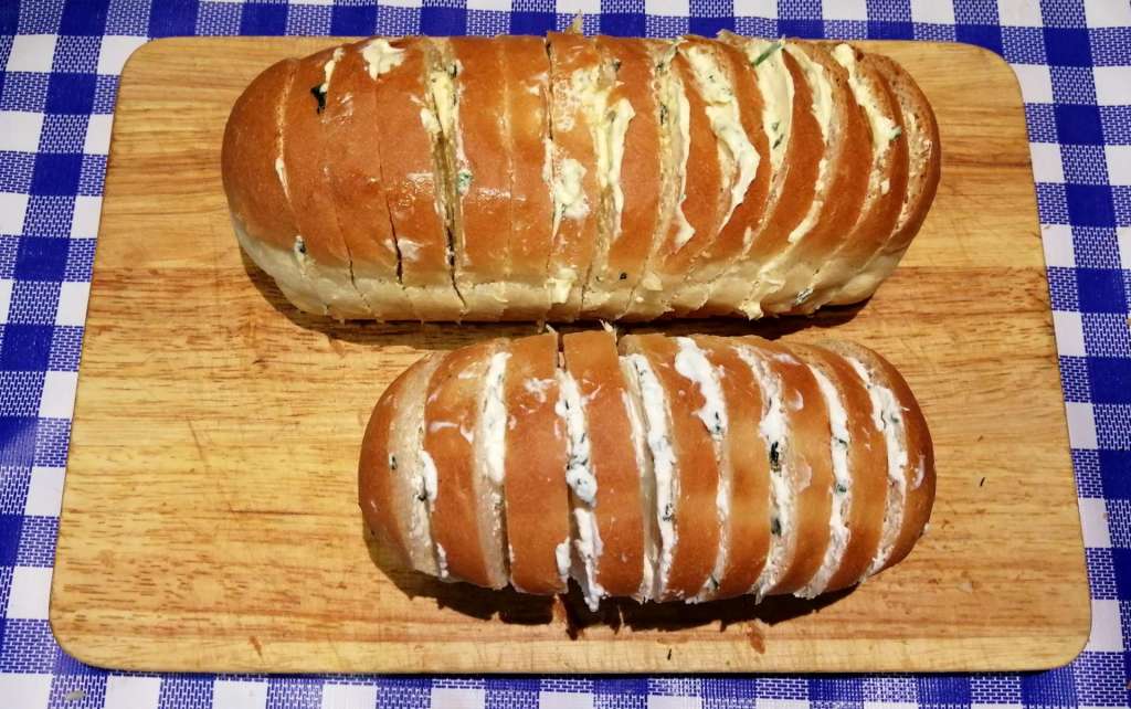 Cortamos en rodajas los panes pero sin llegar a cortarlas del todo, dejándolas unidas por abajo. Mezclamos un un plato o cuenco media tarrina de mantequilla con perejil fresco muy picado. Añadimos tres dientes de ajo rallados.