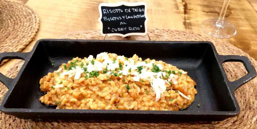 Rissotto de trigo con boletus y langostinos al curry rojo