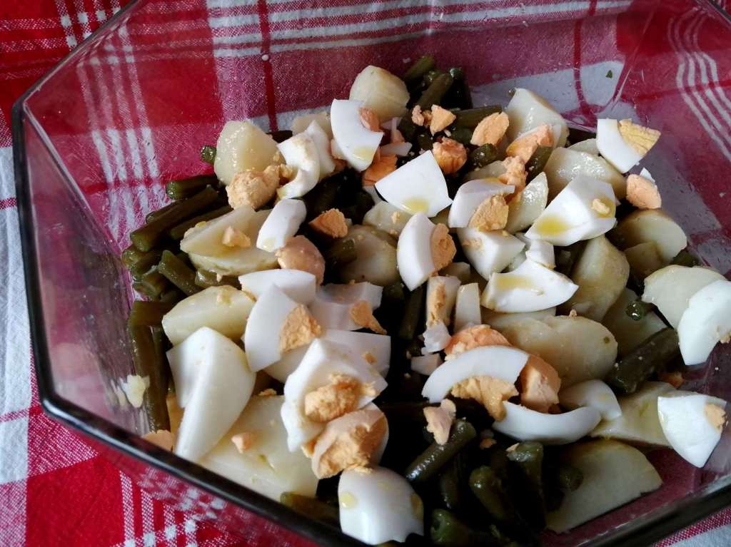 Además son platos muy completos, a los hidratos de las patatas añadimos las vitaminas y proteínas de los otros ingredientes que pongamos. En algunos casos basta con aliñar con sal, aceite y vinagre, como esta de judías verdes y huevo duro.