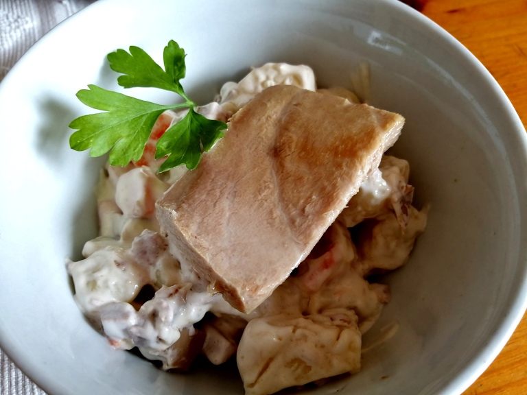 A las patatas cocidas y aliñadas les podemos añadir una salsa mayonesa y tendremos una ensaladilla, riquísima en verano. A la ensaladilla le podemos añadir atún en aceite.