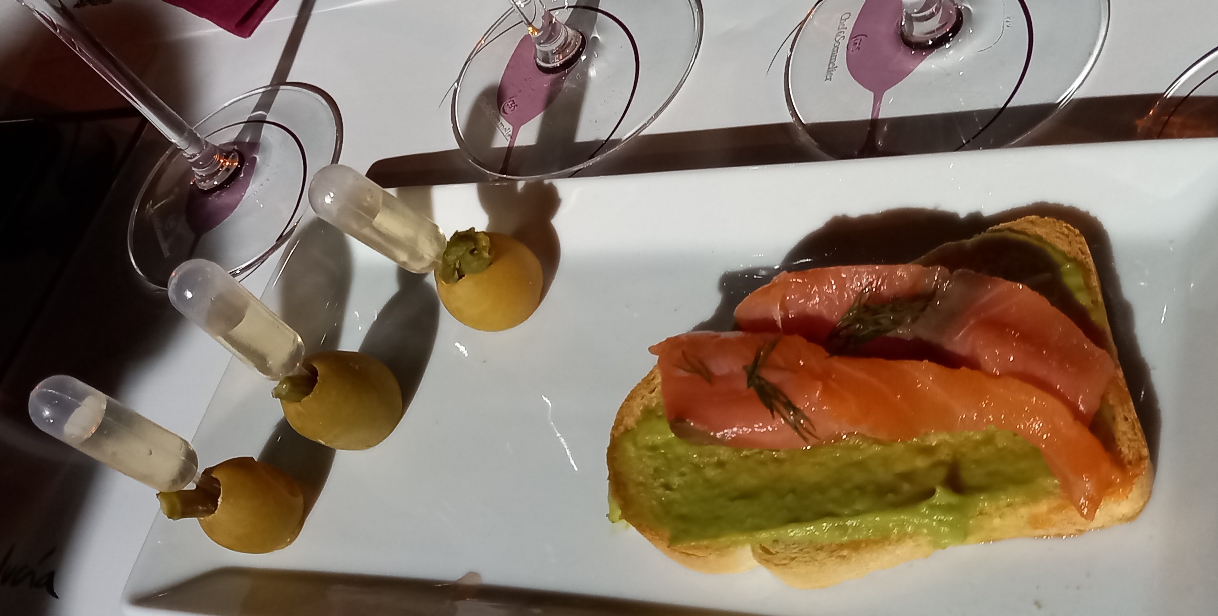 Tosta de salmón y aguacate, aceituna manzanilla con espárrago de Alcalá del Valle y vino blanco Galestro de Alcala del Valle.