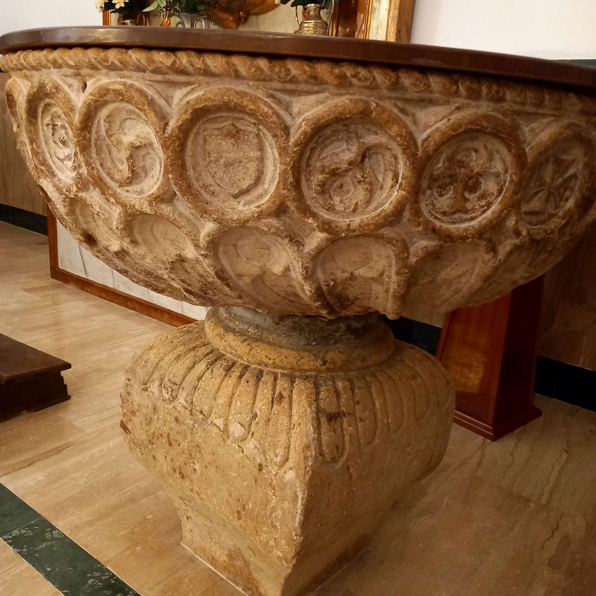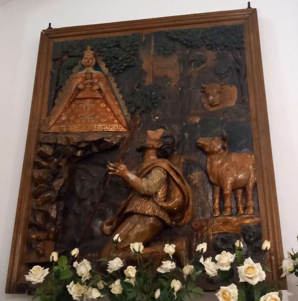 Esta es de piedra tallada y, junto con el altorrelieve policromado que formaba parte del retablo, se encuentran en la Iglesia Parroquial.