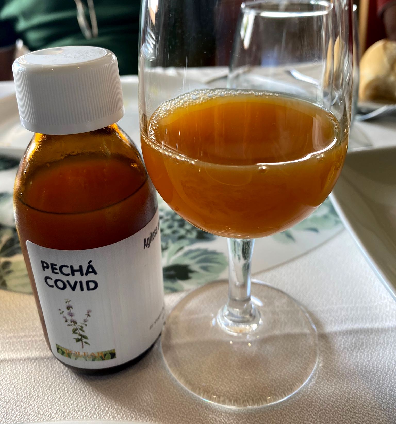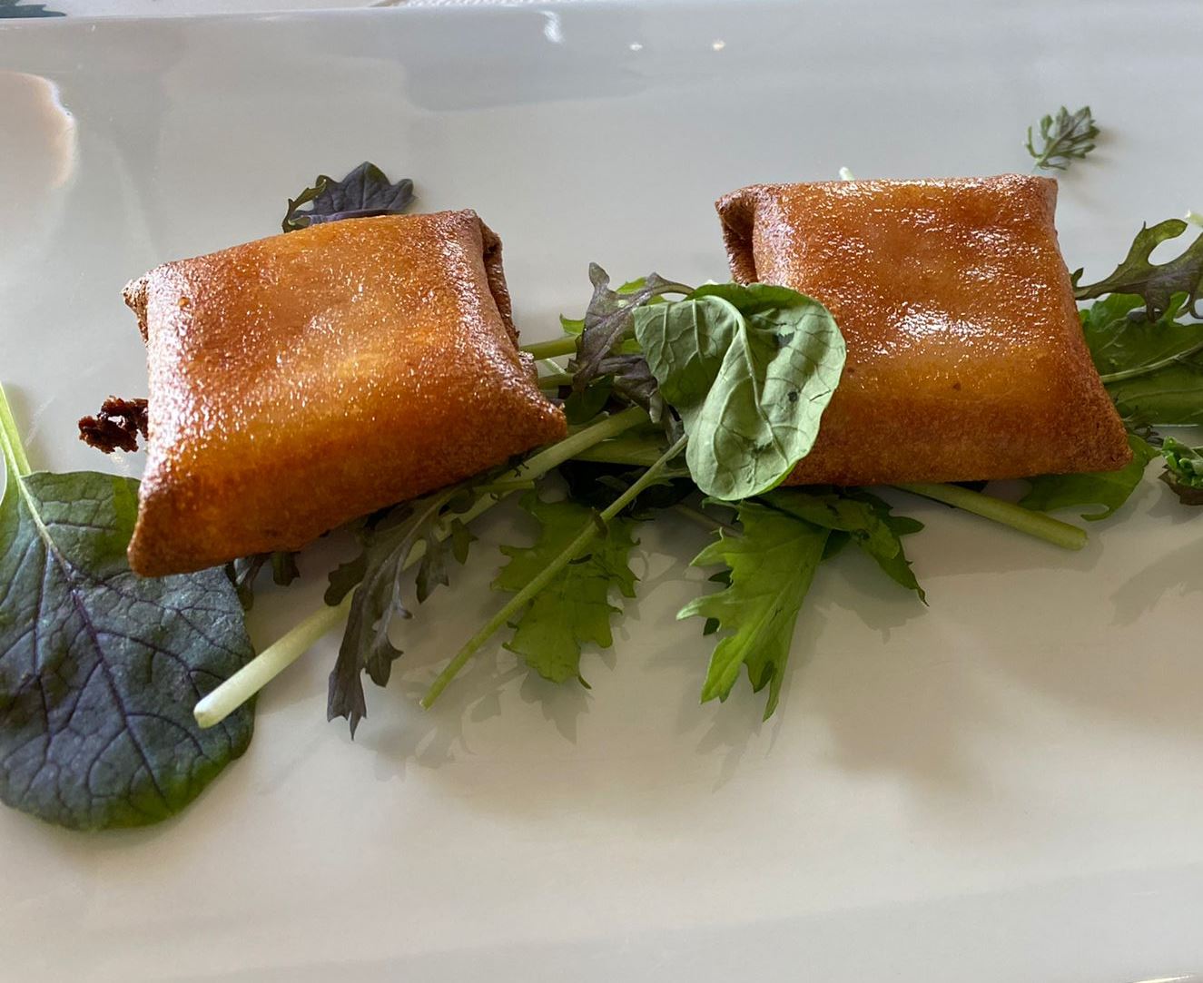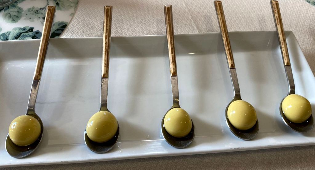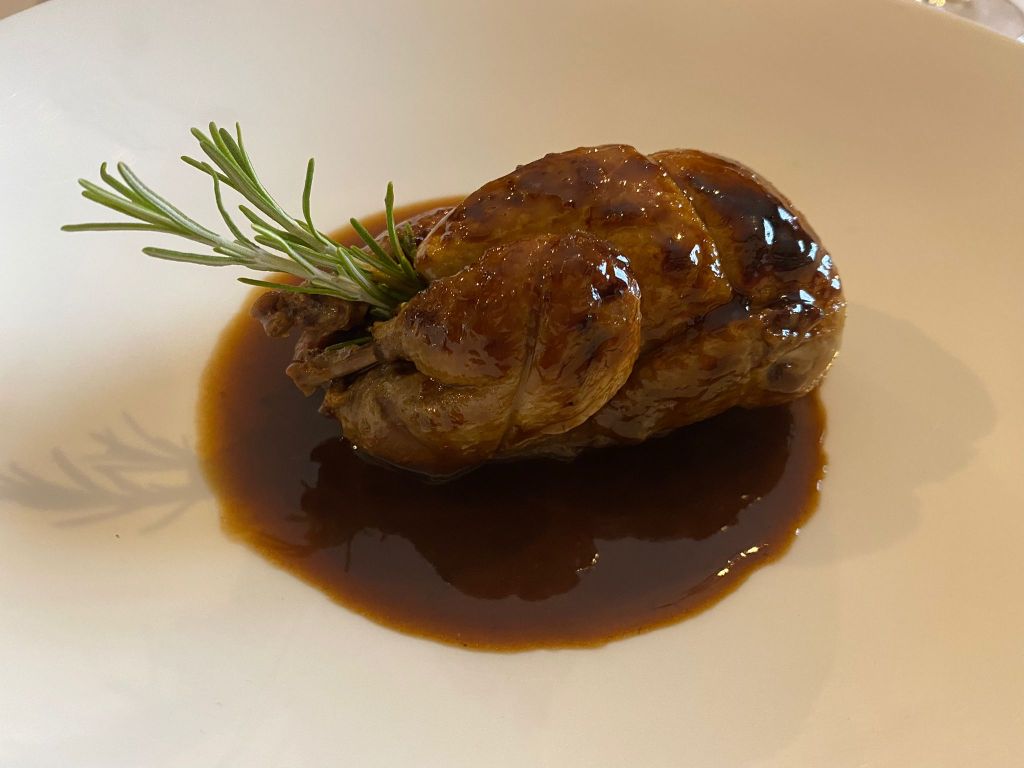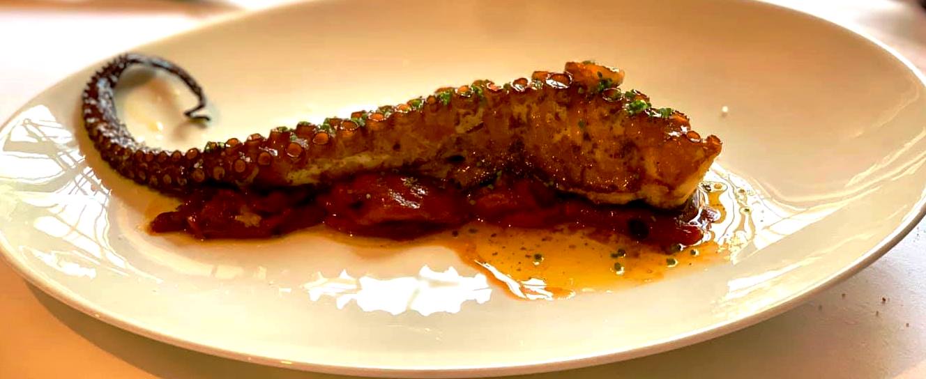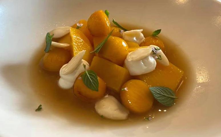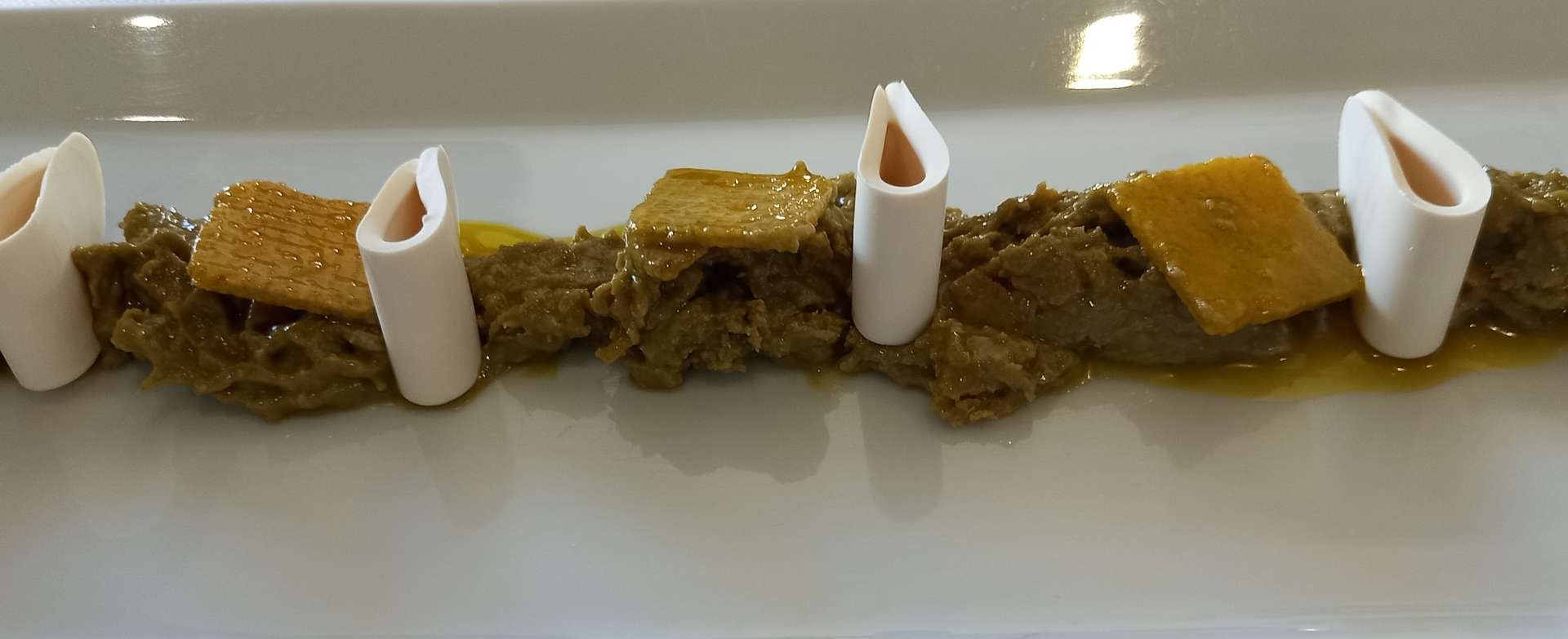 Juan Jesús Cruces y su hermano llevan este restaurante con muchísimo acierto, no tienen carta, los platos que elaboran cada día dependen de los productos que les lleguen o puedan adquirir, siempre de la zona y de máxima calidad. Han creado un cóctel para «conmemorar» el Covid a base de zumo de melocotón y oloroso viejo de Sánchez Romate, parecido a un «San Francisco», con el que comenzamos a abrir boca.