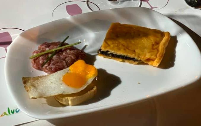 Empanada de morcilla de matanza propia y tartar de salchichón, con el vino 7 Mil Pasos de Ronda