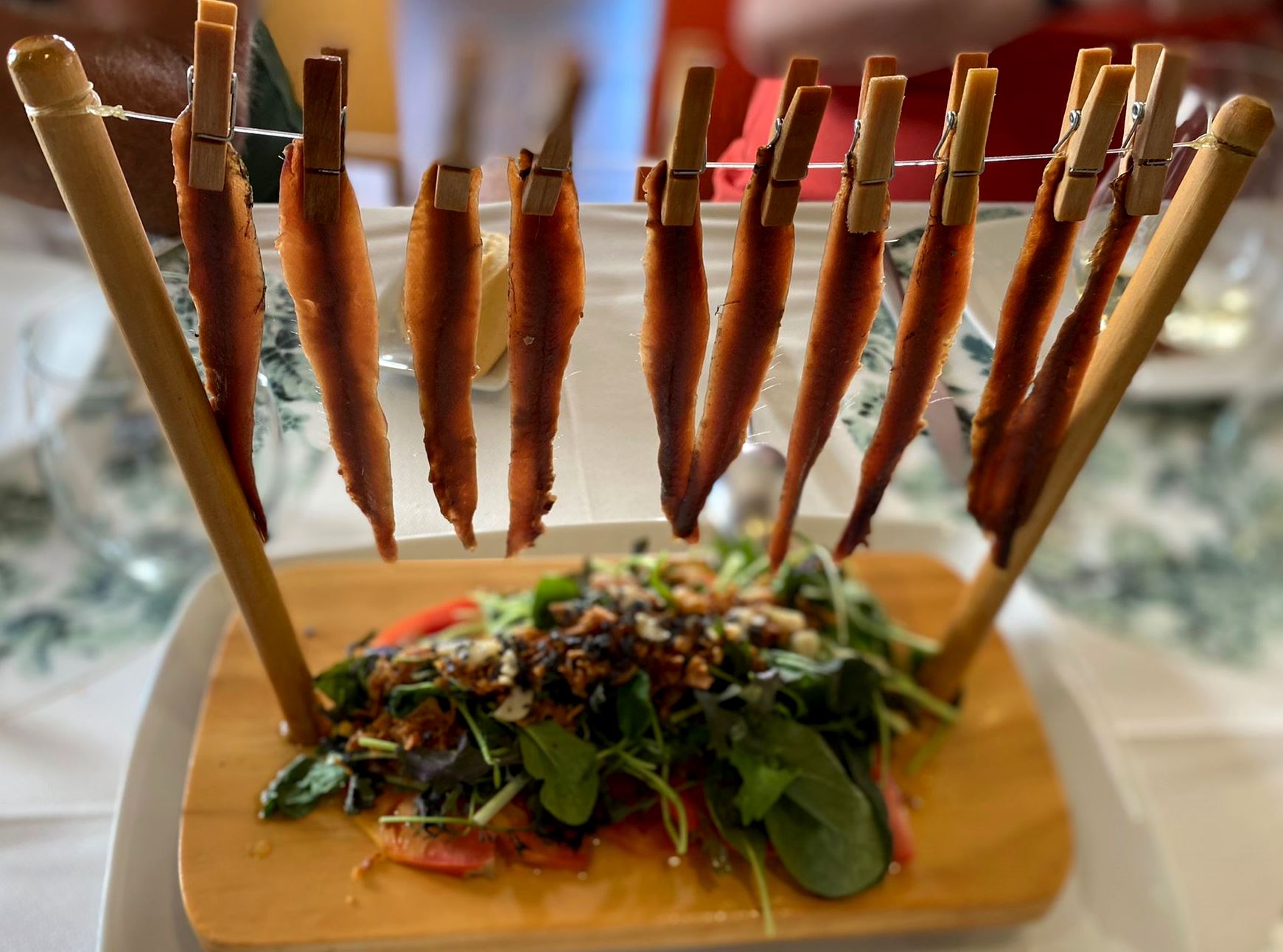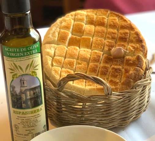 José con su hija llevan adelante este restaurante tan bueno, y José elabora un pan tipo carrete que corta por la mitad, lo tuesta pinchado con un palo de retama y lo presenta con un diente de ajo para tomar con aceite. Buenísimo.