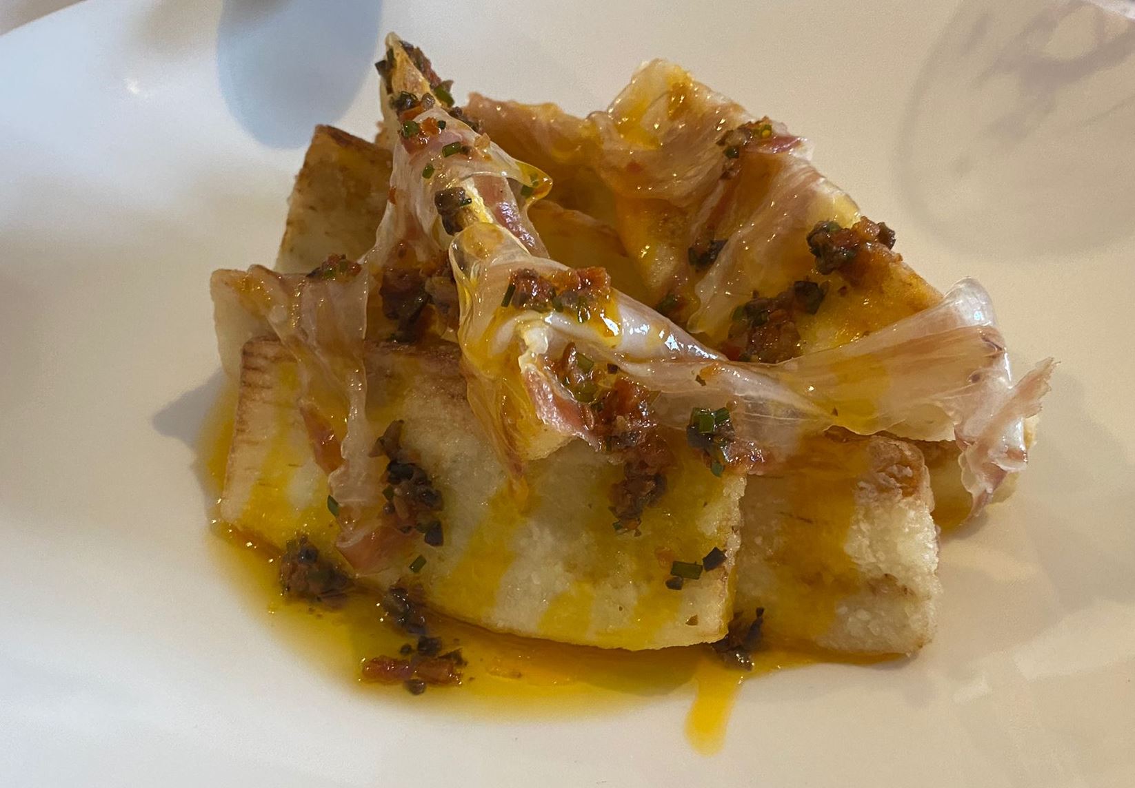 Berenjena blanca frita con yema de huevo y tocino ibérico