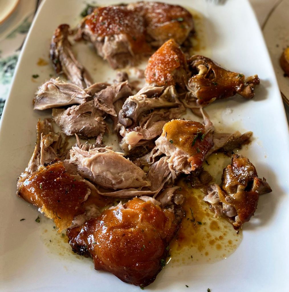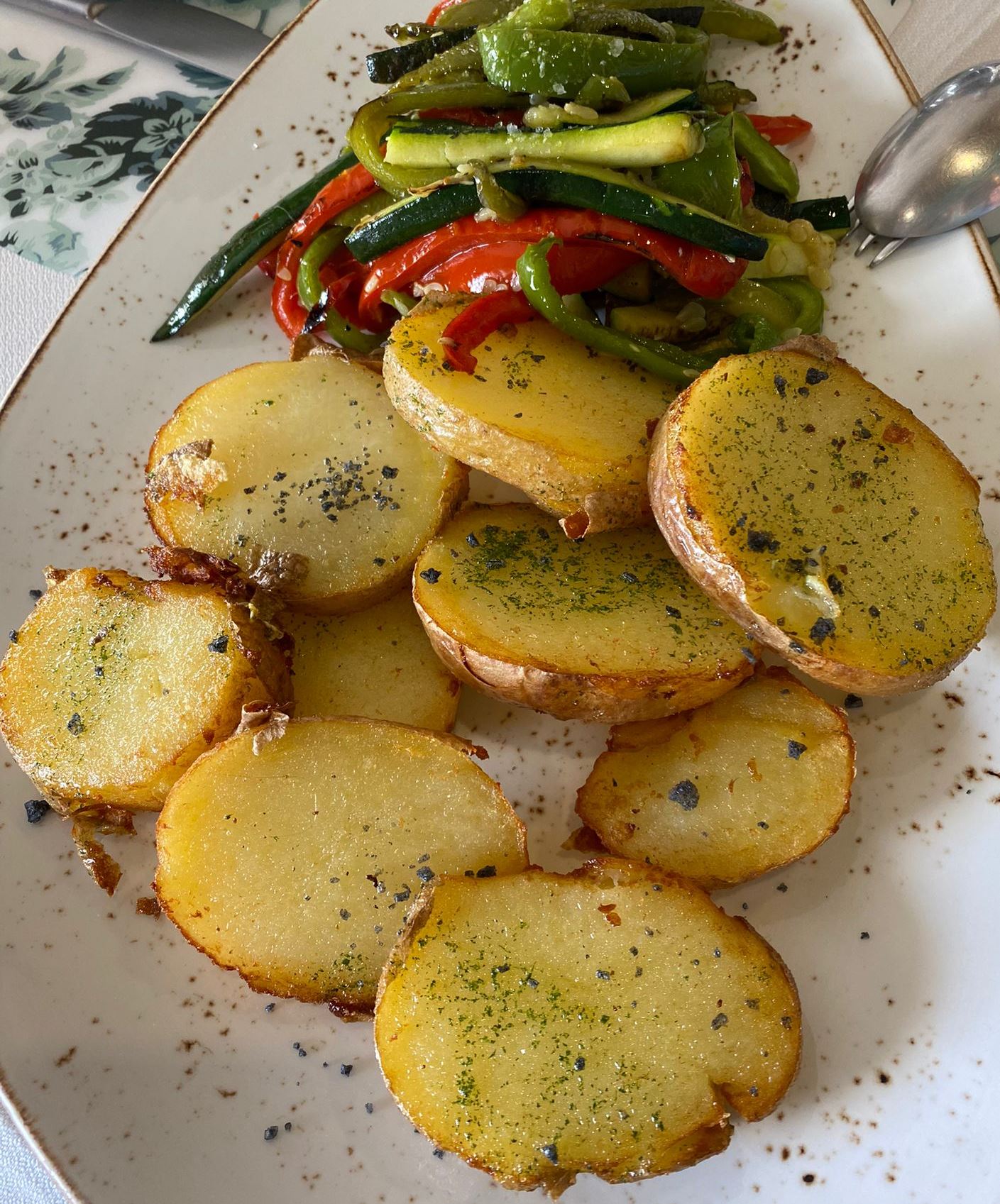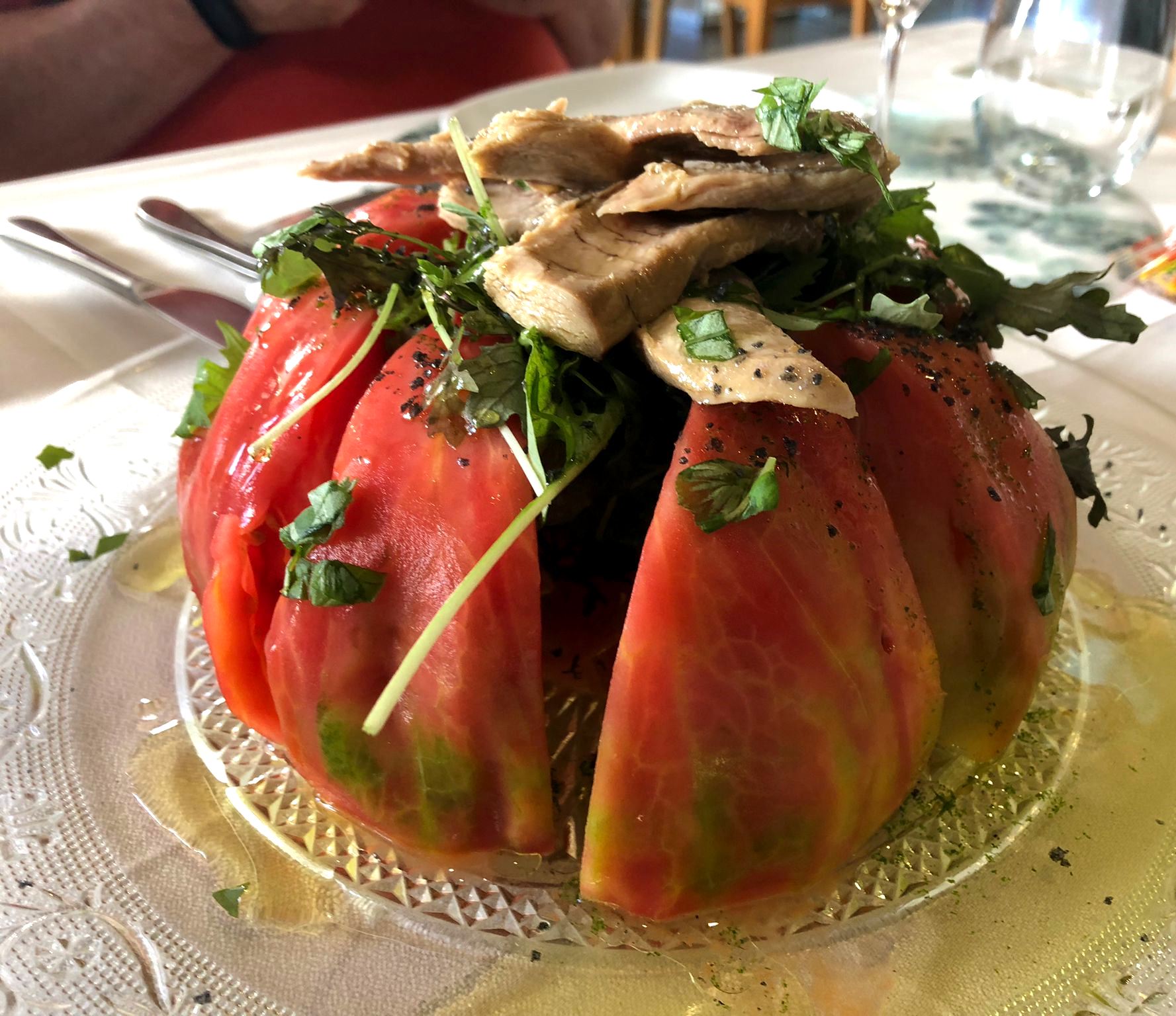 Al no tener carta, y entusiasmarme tanto con cada propuesta, no recuerdo los nombres de cada plato, pero una imagen vale más que mil palabras…El tomate rosa de la zona aliñado con el magnífico aceite de la cooperativa local, con melva, estaba delicioso.