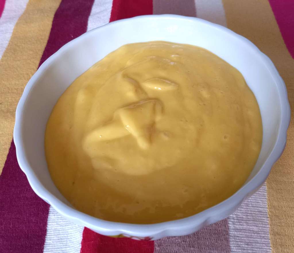 Echamos en el vaso de una batidora la pulpa del mango y los demás ingredientes de la salsa: el aceite, el vinagre, la sal y la miel. Batimos muy bien hasta que quede cremosa.