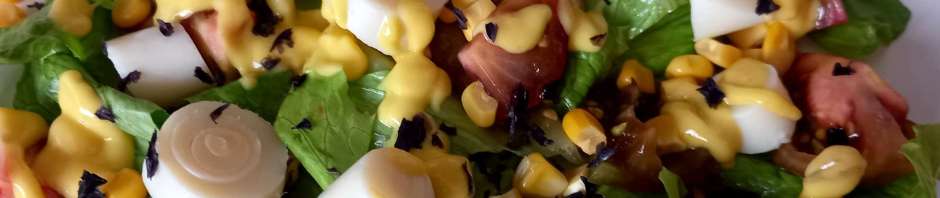 Pues con esta fruta de pulpa de color amarillo anaranjado se pueden hacer platos buenísimos, entre ellos ensaladas. Pero en esta ocasión la hemos usado no como ingrediente de la ensalada sino para hacer una salsa y aderezarla.