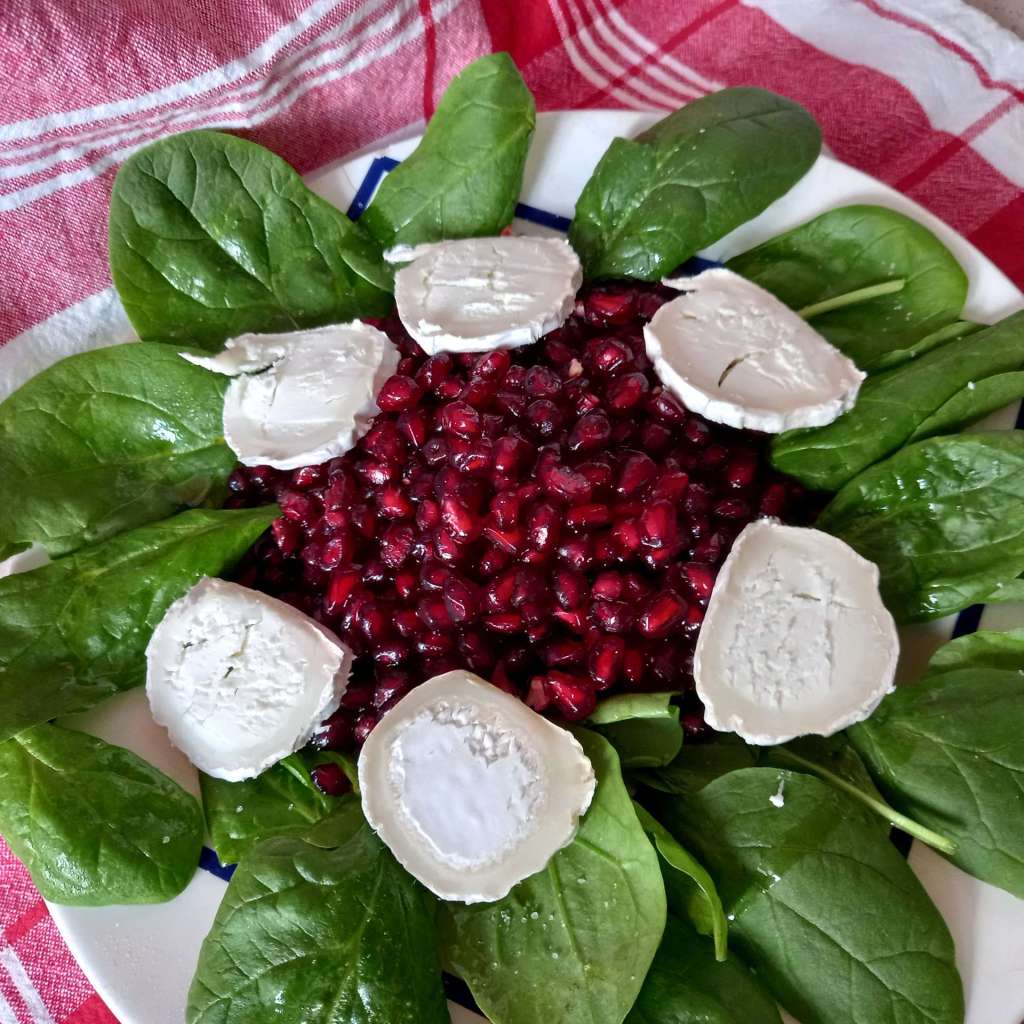 Desgranamos la granada. En una fuente colocamos las hojas de espinacas y las aliñamos. En un cuenco aliñamos la granada con sal, vinagre y aceite, poca cantidad de todo. La ponemos sobre la espinacas y acabamos colocando unas rodajas de queso de rulo de cabra.