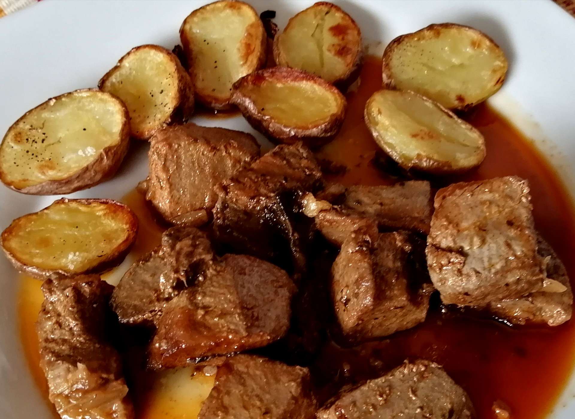 Lo podemos acompañar con patatitas cocidas y después acabadas en el horno o fritas. O hechas directamente en el horno, con aceite y sal por encima.