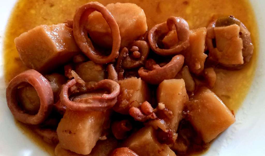 Empezamos poniendo el pimiento choricero en agua caliente para que se hidrate. Picamos el pimiento verde, el ajo y la cebolla. Sofreímos estos tres ingredientes en una olla y los pochamos. Añadimos el pimiento choricero, que lo habremos raspado antes separando la piel.. Aparte en una sartén salteamos los calamares cortados en rodajas y los tentáculos. Los añadimos a la olla. En la sartén echamos el brandy para desglasar y lo añadimos a la olla. Ya solo queda echar el vino, agua que lo cubra y las patatas que habremos pelado y cortado en dados.