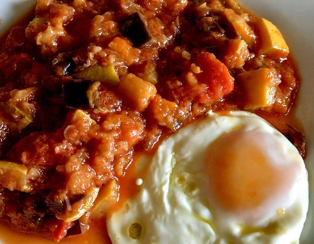 Ya tenemos el pisto. Freímos los huevos y servimos en cada plato un huevo frito con una porción de pisto. Este plato requiere un buen pan para mojar en el huevo y rebañar el plato…