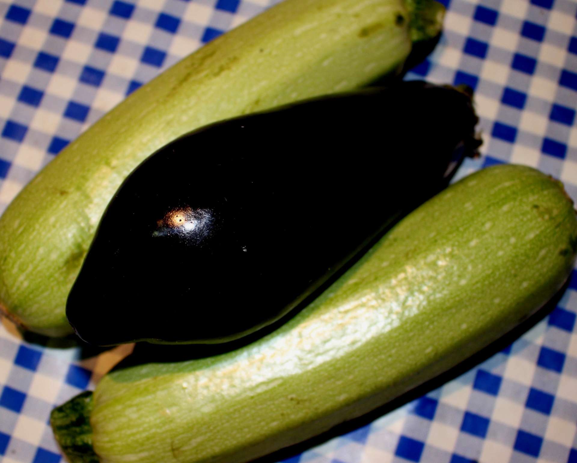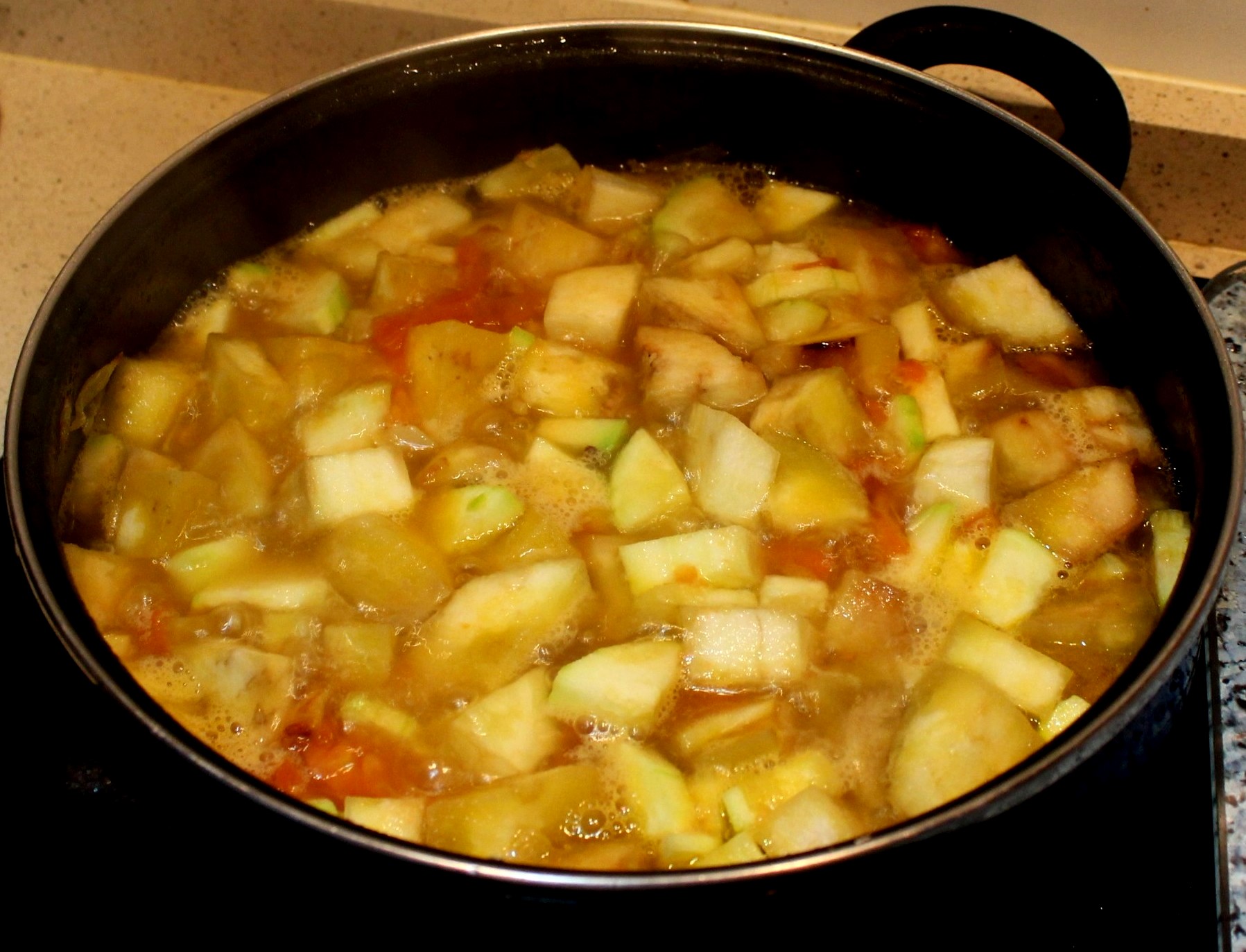 Picamos todos los ingredientes. En una sartén grande y profunda, o en una olla, echamos aceite y sofreímos la cebolla, el ajo y el pimiento. A continuación echamos las berenjenas y calabacines, las rehogamos y añadimos sal, agua y el vino, y las dejamos hacer hasta que estén tiernas.