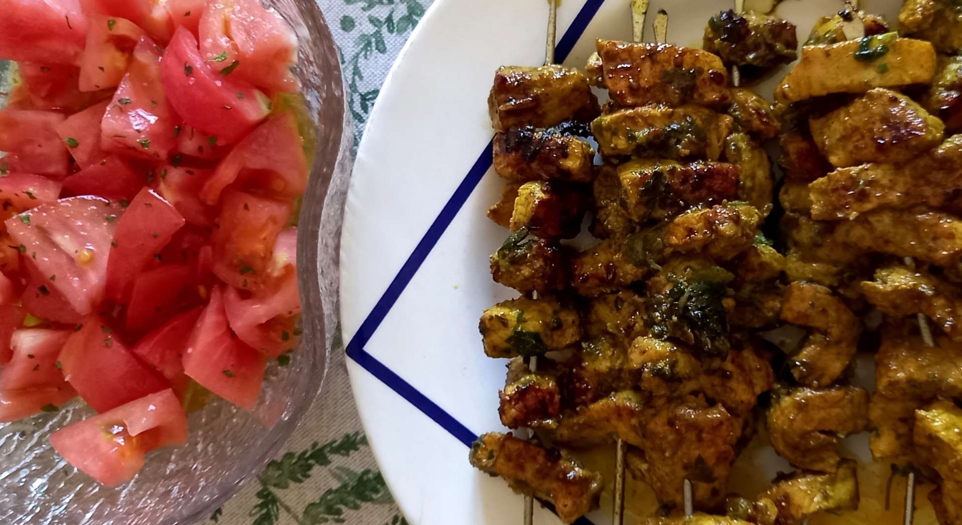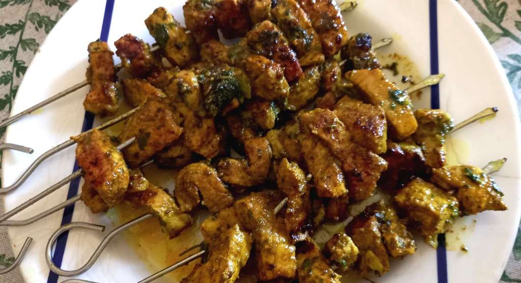 Pinchamos 5 o 6 trocitos en cada pincho y los asamos en una plancha, hasta que estén hechos. Y listo, están muy sabrosos y riquísimos.