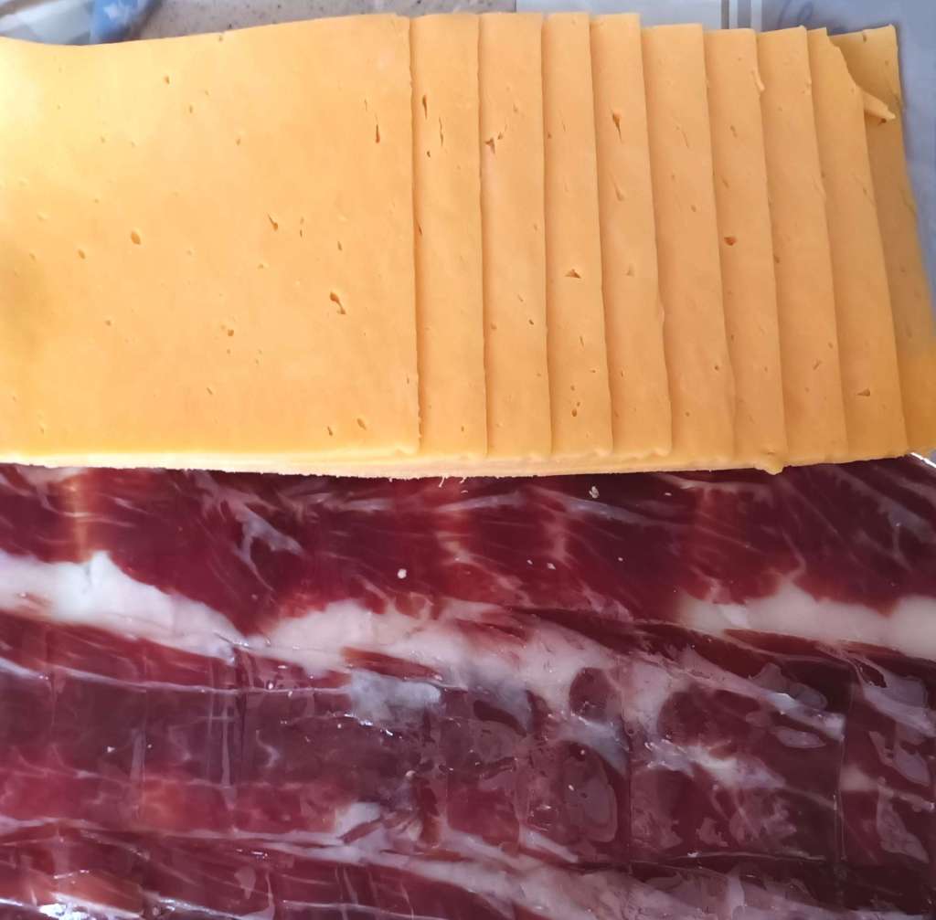 Colocamos un filete, lo salamos y encima ponemos jamón, que cubra toda la superficie, y sobre el jamón lonchas de queso. Sobre esto colocamos otro filete al que también echaremos un poquito de sal. Debemos procurar que los dos filetes tengan el mismo tamaño aproximado, para que casen bien.