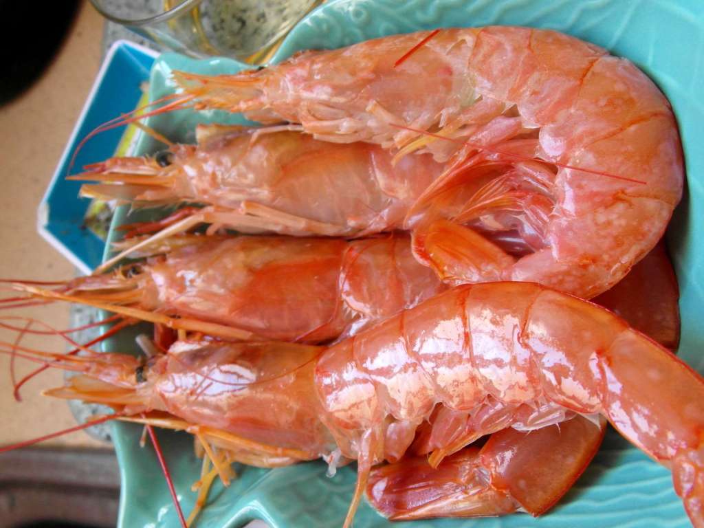 Refreímos el ajo y la cebolla cortaditos, añadimos los pimientos también picaditos. Pelamos los gambones y aplastamos las cabezas, para que suelten jugo. Las sacamos.