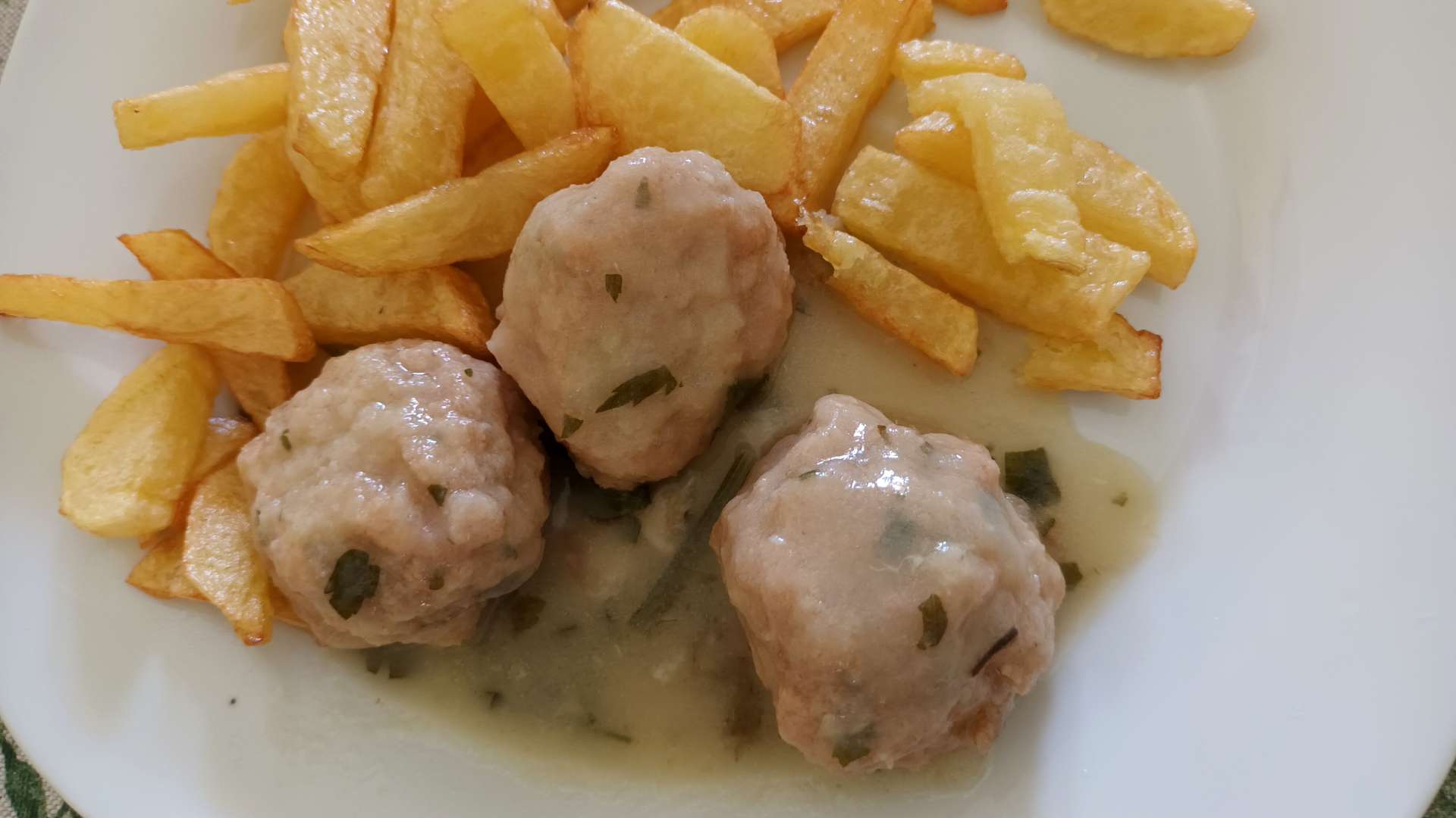 En una olla echamos aceite y sofreímos la cebolla, el ajo y el perejil, muy picaditos. Añadimos el vino y el caldo, un poco de sal y echamos las albóndigas, dejándolas cocer hasta que la salsa espese un poco.