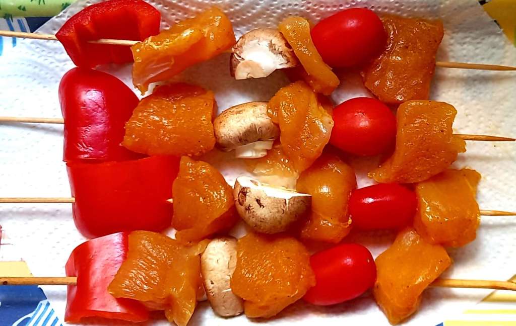 Cortamos en trozos el pimiento rojo, y los champiñones por la mitad. Cuando vayamos a hacer las brochetas pinchamos de forma alternativa un trozo de pimiento, uno de pollo, medio champiñón, otro de pollo, un tomatito…Así hasta formar varias brochetas.