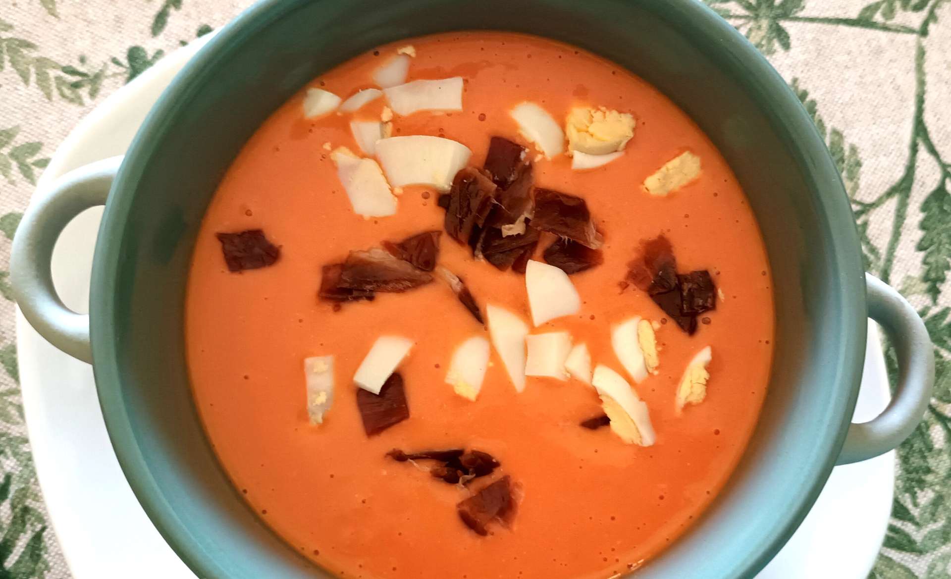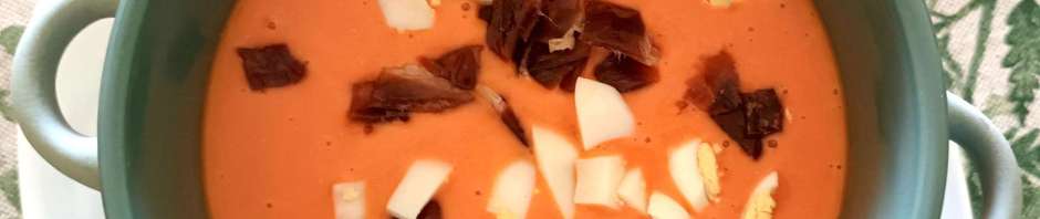 Decorar con huevo duro y trocitos de jamón. Y ya tenemos el típico salmorejo cordobés, plato estupendo para los días de calor que estamos pasando y los que están por llegar.