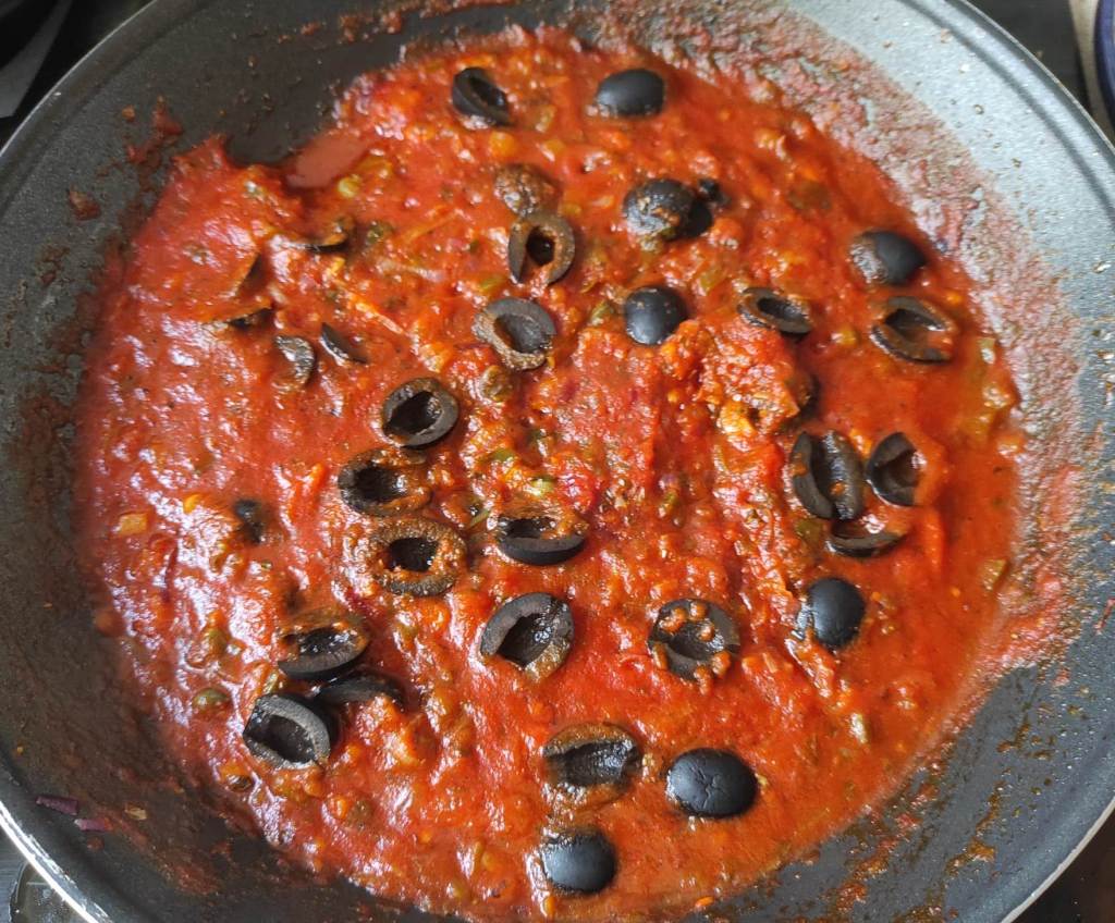 En primer lugar hacemos la salsa, sofriendo la cebolla y añadiendo tomate triturado, hasta que quede una salsa espesa. Añadimos el orégano y el tomillo, las aceitunas y las anchoas en trocitos. Mezclamos todo bien y salamos a gusto.
