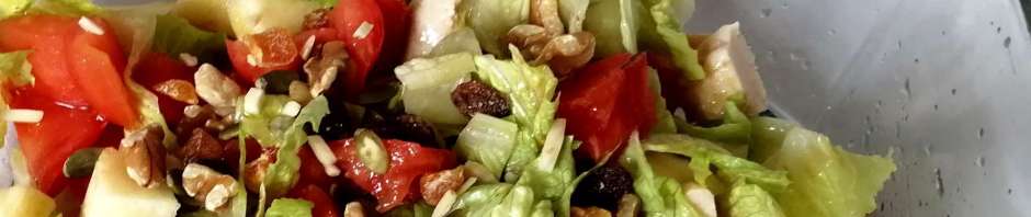 Cortamos la lechuga, el tomate, el pollo y la manzana pelada. Echamos todo en un cuenco, añadimos los frutos secos y aliñamos con sal, vinagre y aceite.