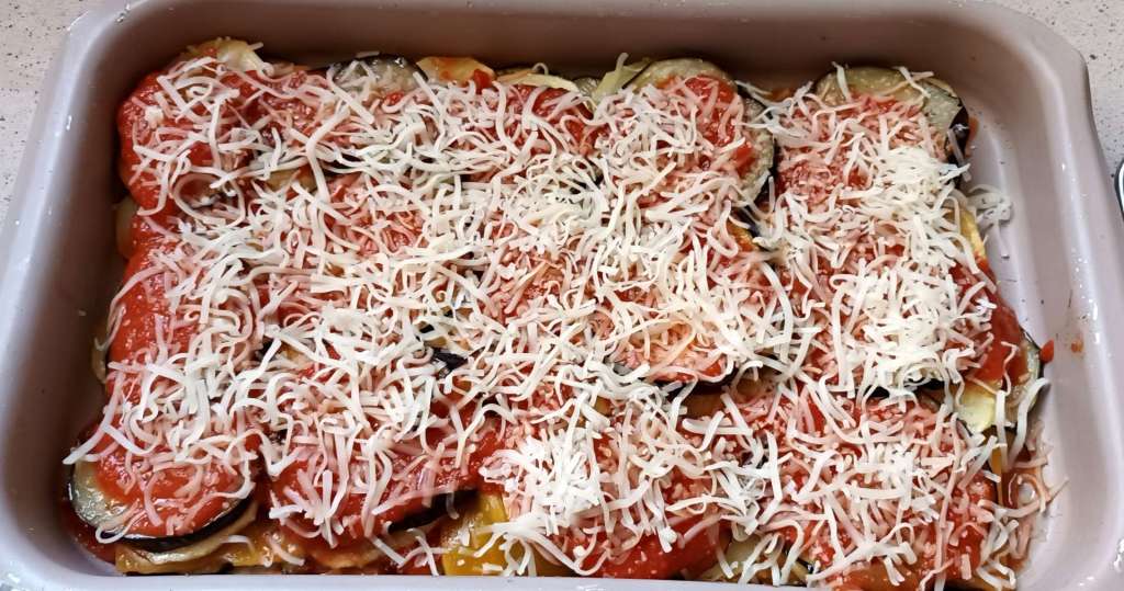 En una bandeja de horno ponemos una capa de patatas, encima otra de berenjenas y sobre ellas tomate frito, no mucho. Salamos. A continuación una capa de lonchas de queso.